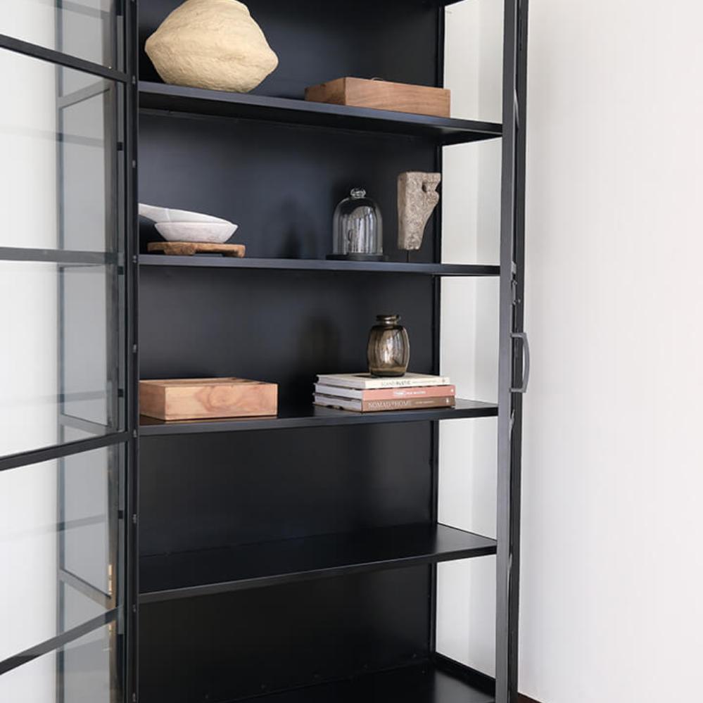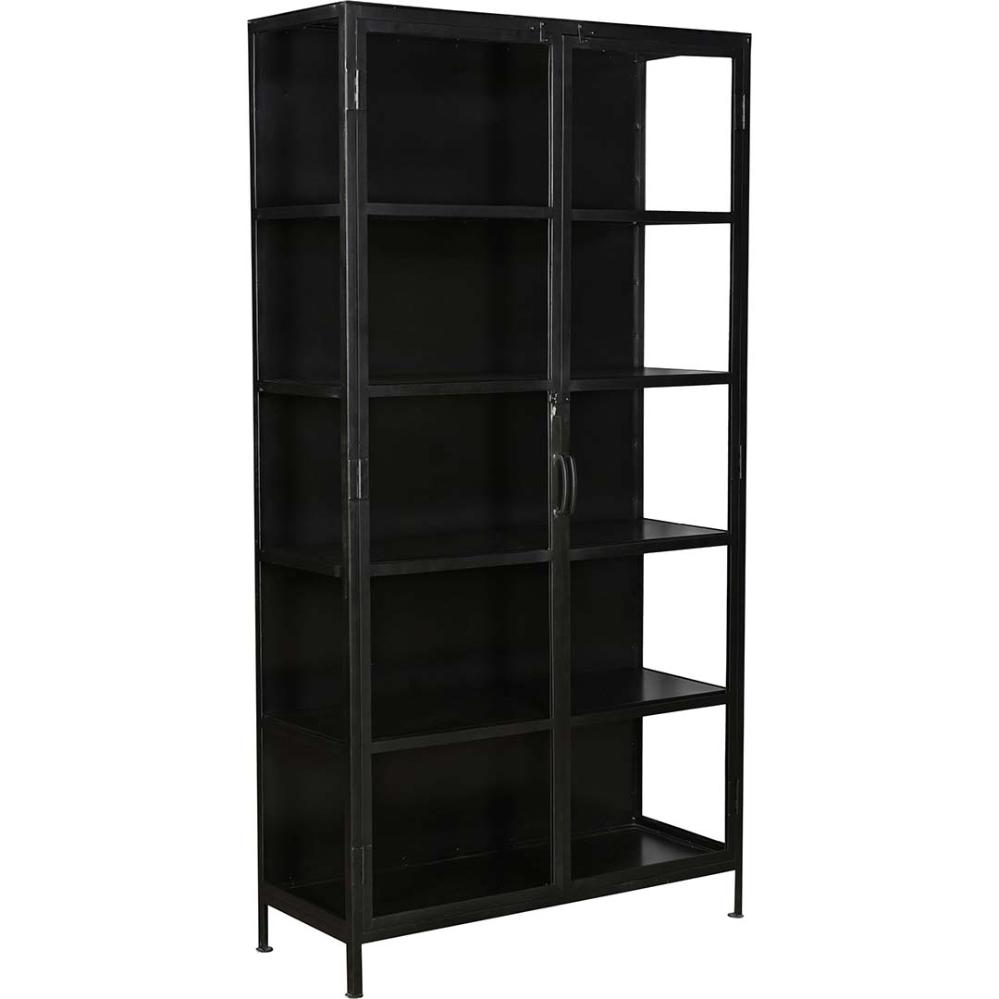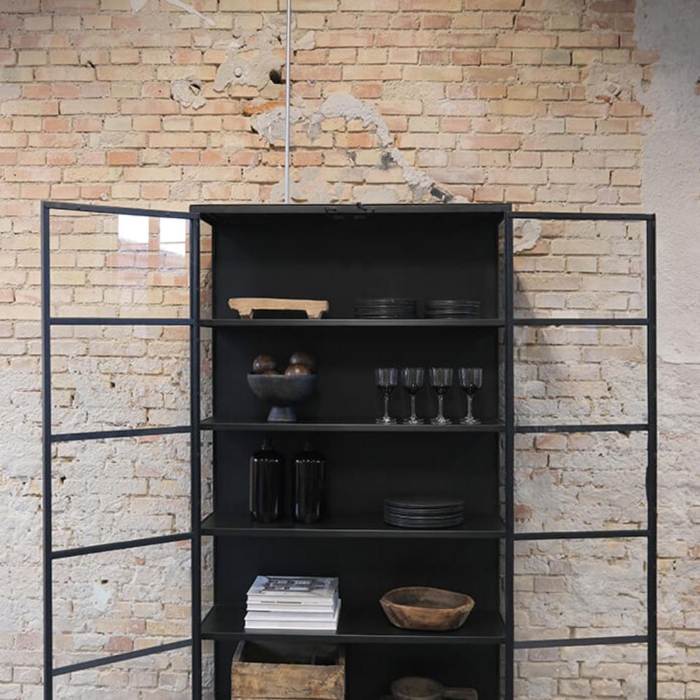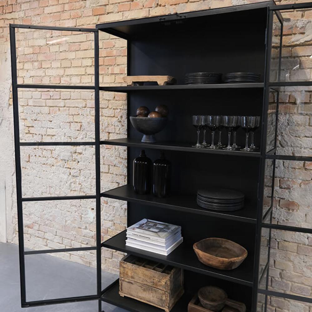 En Trademark Living darling. Dette fantastiske vitrineskab i sortlakeret jern har det hele. Stor rummelighed, 5 hylder og glas i både front og på siderne. Et lækkert, råt vitrineskab med et supercool industrielt look, der tager sig flot ud i det klassiske og moderne hjem. Du finder en matchende skænk med to hylder under varenummer: M09045. Afstanden mellem hylderne er 34 cm.