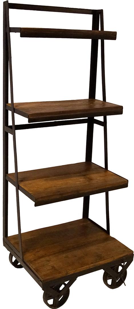Smuk, charmerende reol på 4 grove hjul med 4 hylder. Reolen har et rustikt jernstel med 4 træhylder der bliver smallere og smallere mod toppen. Reolen er både praktisk og dekorativ og vil være helt oplagt i din blomster- eller interiørbutik til udstilling af produkter. I hjemmet kan du bruge den hvor som helst du har brug for en rustik reol til dine nips, dit porcelæn eller tøj. Hyldedybden er nedefra og op: 50 cm, 40 cm, 30 cm, 20 cm. Afstanden mellem hylderne er 39 cm.
