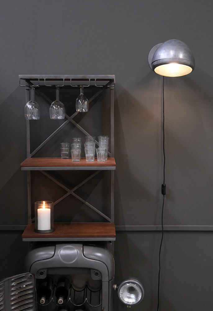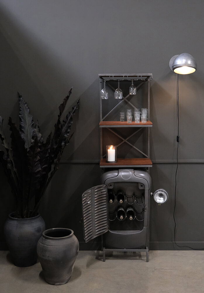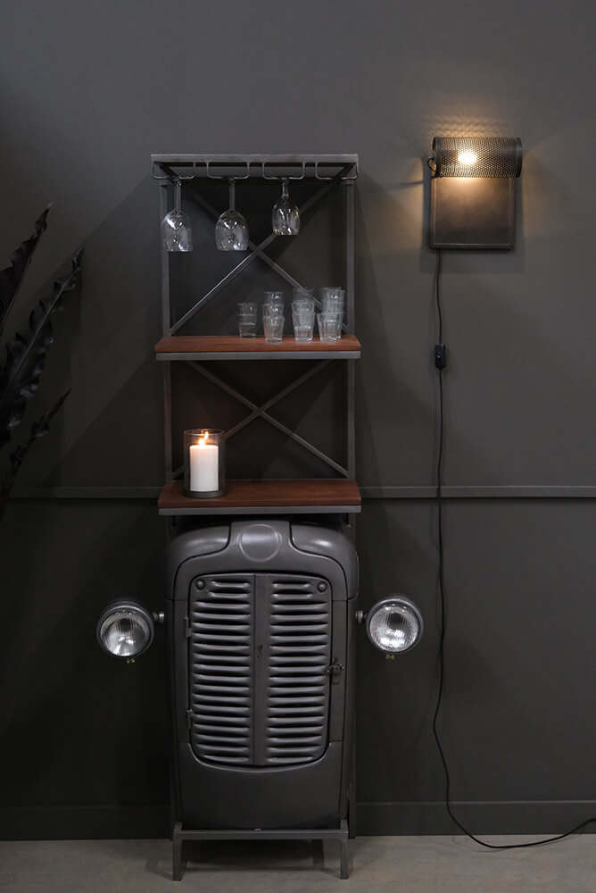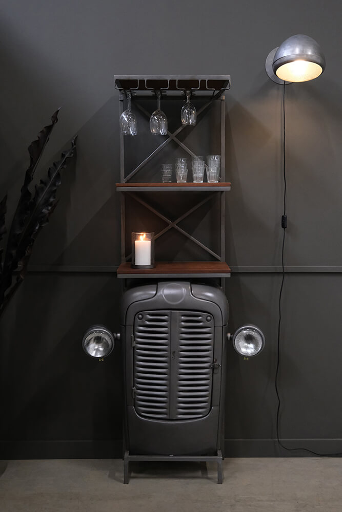 Cool reol med gammel traktorfront. Reolen har en fin detalje der giver mulighed for opbevaring af 8 flasker vin samt jernophæng til glas på stilk. Reolen har to hylder fremstillet i genanvendt træ. OBS: Vidde: 51cm reol / med lygterne 85cm.