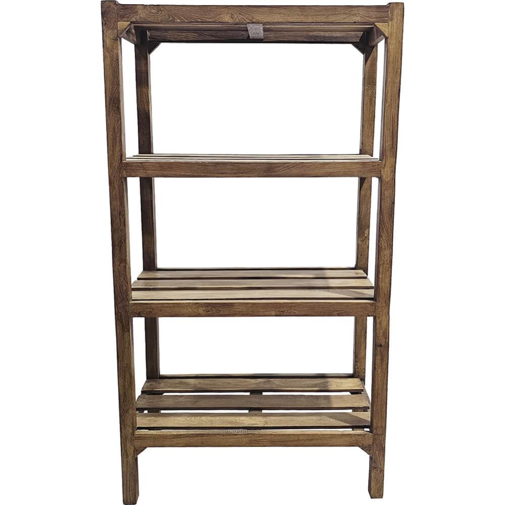 Denne gamle træreol er lavet af teaktræ og har præcis det rå og ærlige udtryk, der gør et møbel interessant. De enkle lamelhylder og den håndlavede konstruktion giver reolen et naturligt, rustikt look med masser af varme og karakter. Teaktræet har den der gyldne glød og levende struktur, som kun bliver smukkere med tiden. Og med tydelige spor af brug og håndværk får du en træreol, der ikke er bange for at vise, hvor den kommer fra. Brug reolen i butikken til udstilling, i restauranten til opbevaring eller i dit hjem, hvor der er behov for et møbel med personlighed. Den fungerer perfekt i alt fra køkken til stue og kontor. En tidløs og funktionel træreol med sjæl og attitude.