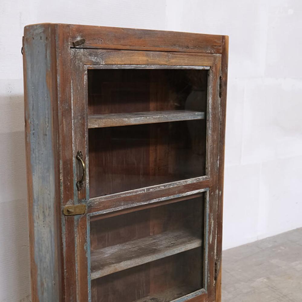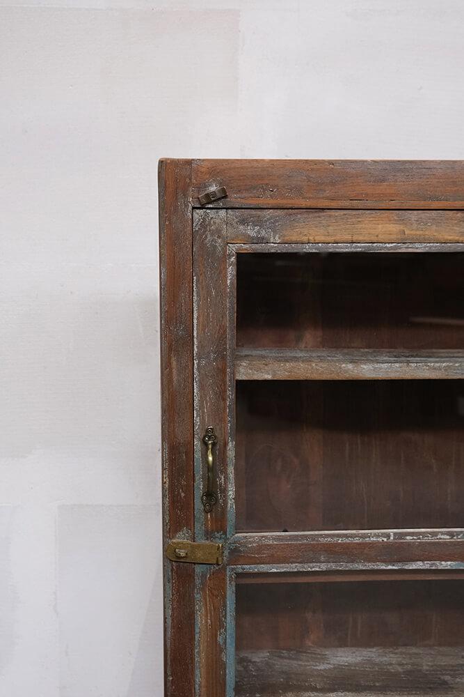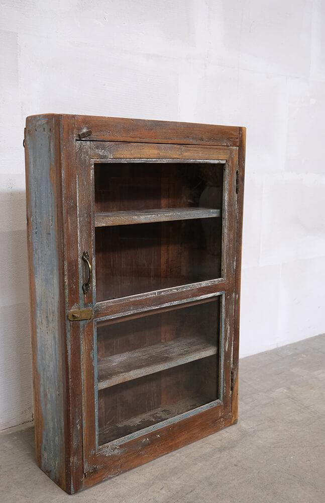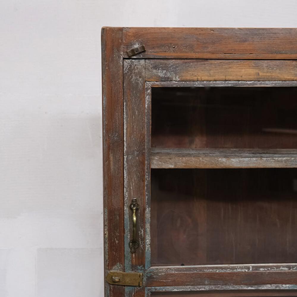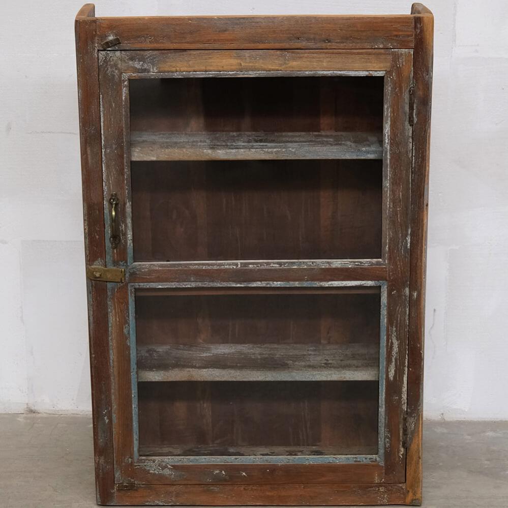 Dette vægskab oser af autentisk vintagecharme med sin robuste og slidte træramme, der bærer tydelige spor af tidens tand. Hylder bag de rustikke glasruder giver rig mulighed for at udstille dine mest skattede genstande, mens det lille messinghåndtag tilfører en klassisk, old-school detalje. Træets naturlige patina og de små skrammer fortæller en historie om et langt og anvendeligt liv, hvilket gør skabet til den perfekte "One of a Kind" tilføjelse til enhver indretning, der søger sjæl og historie. Dette vægskab er både funktionelt og dekorativt – en sand samtalestarter til dine vægge.