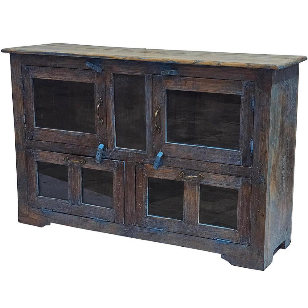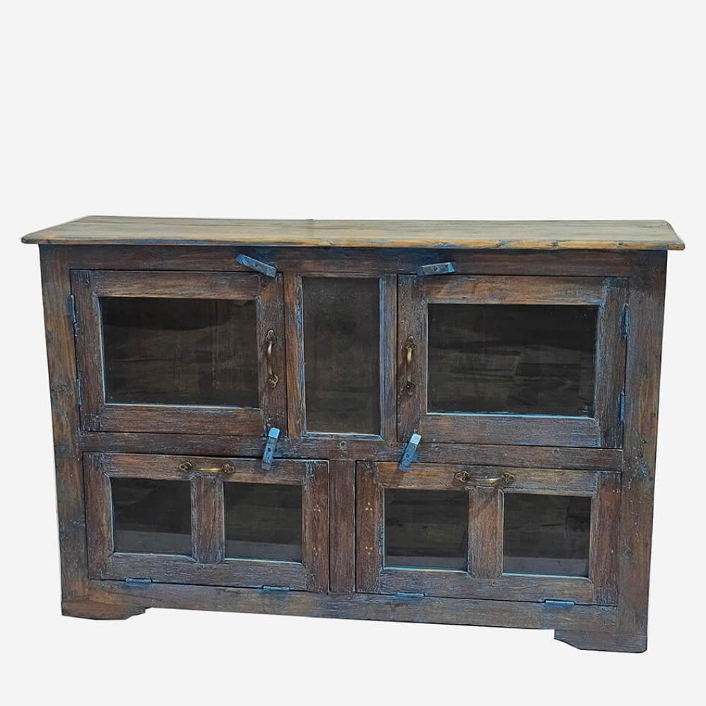 Denne mørke, patinerede skænk er et møbel med tyngde, karakter og praktisk anvendelighed. Med fire låger, solide jernbeslag og glaspartier, kombinerer den det rå og industrielle med et strejf af vintage elegance. Skænken er fremstillet af massivt træ og har tydelige spor af brug, alder og håndværk, præcis som det skal være. De klassiske greb og synlige hængsler understreger det autentiske look, mens den enkle konstruktion lader materialerne tale for sig selv. Her får du opbevaring med holdning. Brug skænken i caféen eller restauranten til service og opbevaring, i butikken som display eller i hjemmet, hvor den både skaber ro og råhed. Den fungerer perfekt som vitrine, barskab eller til alt det, du gerne vil vise frem, men stadig have styr på.