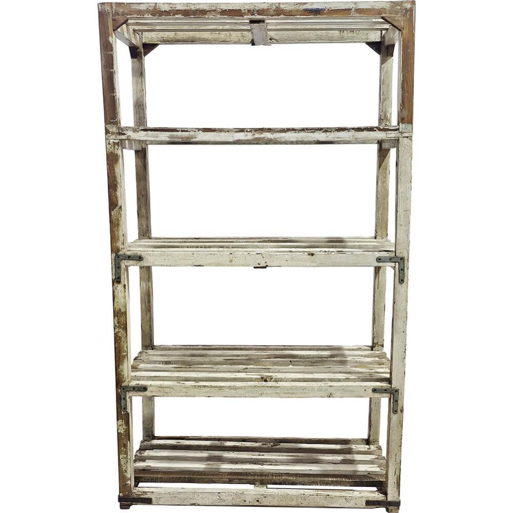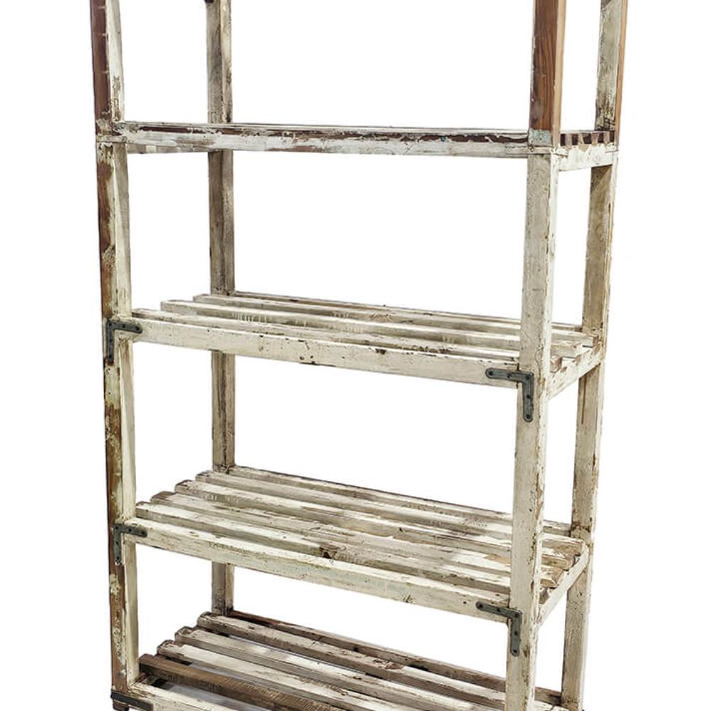 Denne vintage træreol er alt andet end kedelig. Den er lavet af massivt træ og har den slags cremefarvede patina, som kun tid og slid kan skabe. Med sit skæve udtryk og rå finish er det en træreol, der ikke forsøger at være fin, men som alligevel stjæler opmærksomheden i ethvert rum. Reolen er fundet i Indien, hvor den har haft et arbejdsliv bag sig. Det ses og mærkes. De slidte overflader, afskallede maling og solide jernbeslag fortæller en historie om funktion før pynt, og netop det giver reolen sin autentiske charme og sit rustikke look. Brug træreolen i butikken til at fremvise varer med kant, i caféen til opbevaring eller som rå kontrast i en minimalistisk bolig. Den fungerer perfekt som opbevaringsreol, displayreol eller bare som et møbel med charme og holdning.