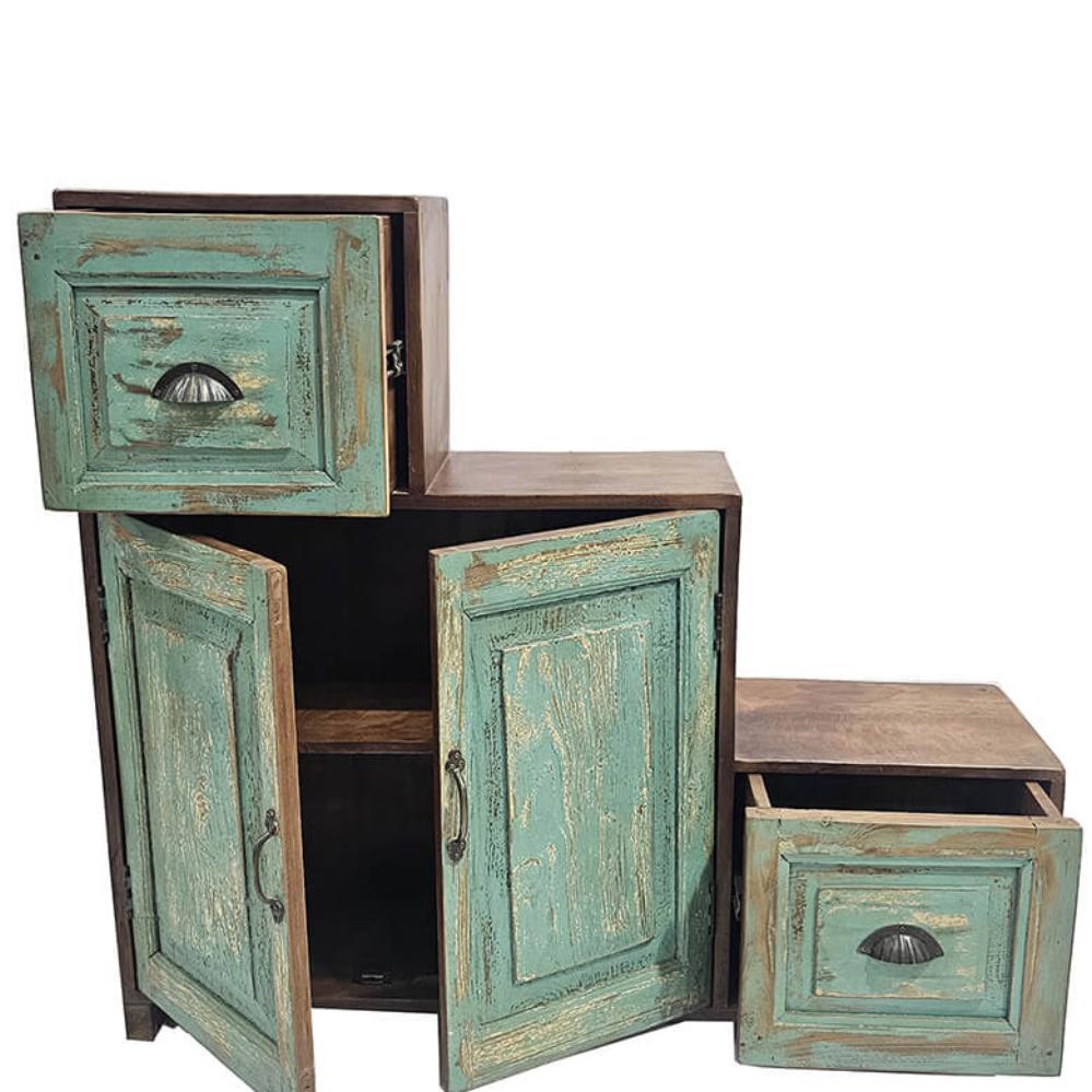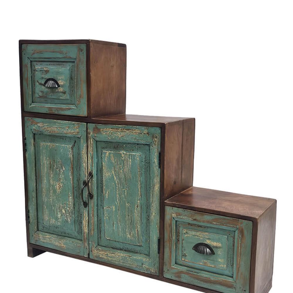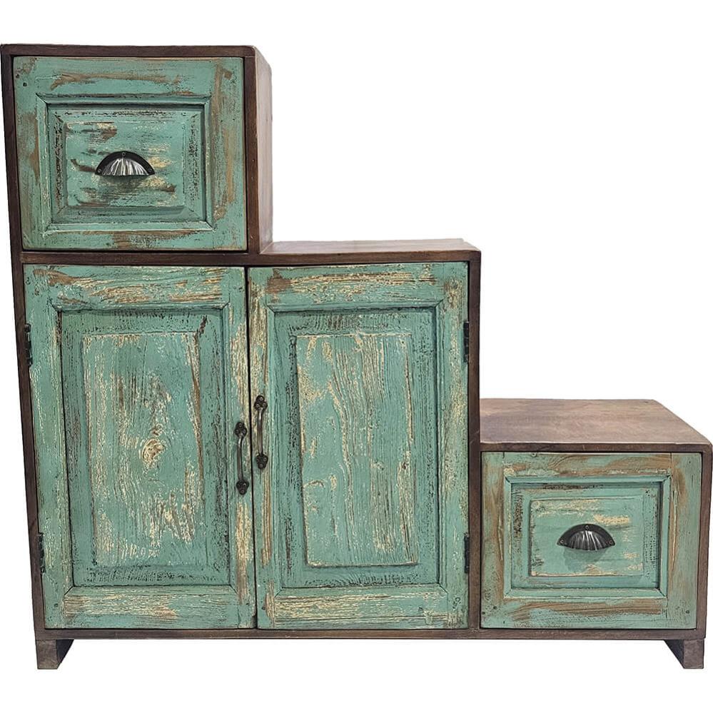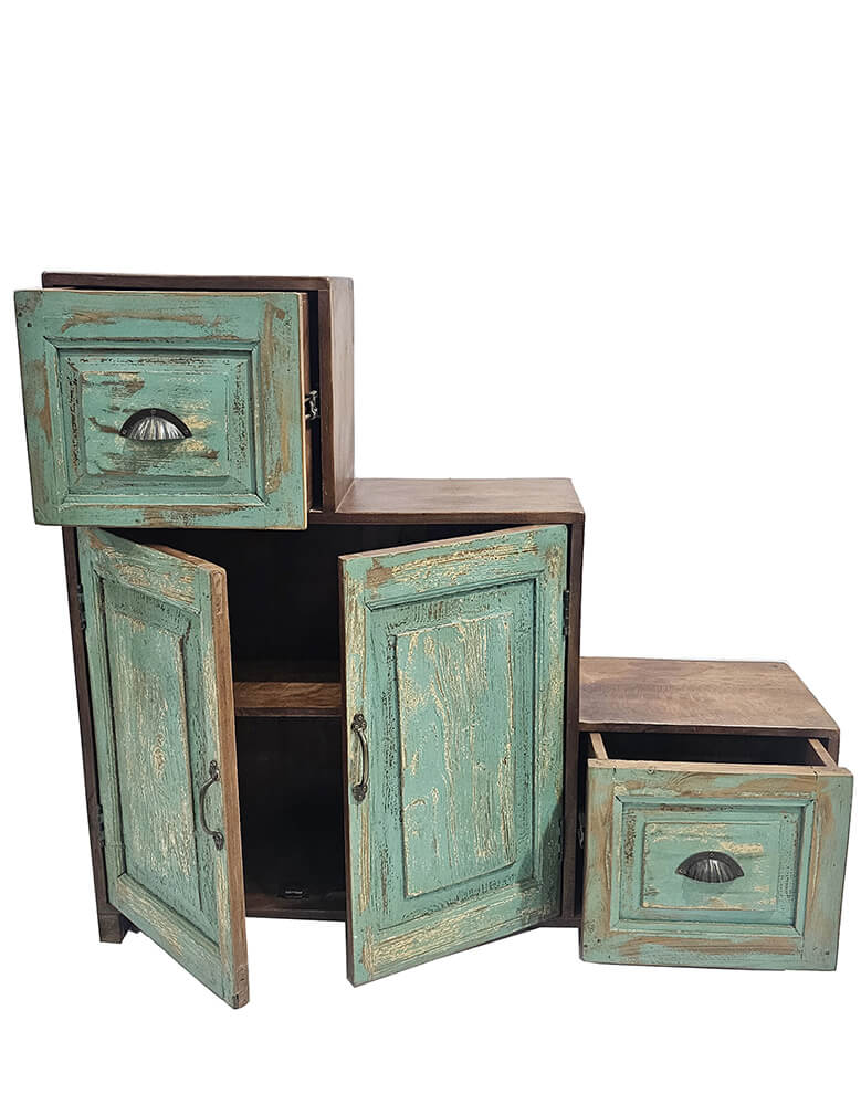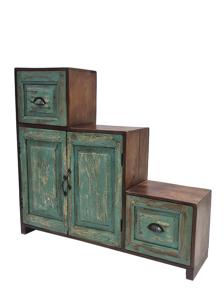 Et charmerende trappeskab, der forener funktionalitet og personlighed i ét møbel. Skabet er fremstillet af genbrugstræ med en smuk, patineret overflade i turkisgrønne nuancer, som giver et unikt og levende udtryk. Den karakteristiske trappeform skaber et spændende visuelt element, mens de to rummelige skuffer, der måler 35 x 30 cm og dobbeltdørene tilbyder god opbevaringsplads til alt fra bøger og tekstiler til nips og køkkenting. De mørke metalgreb understreger det rustikke look og gør skabet til et perfekt valg for dig, der elsker møbler med farve og historie. Brug det som et dekorativt opbevaringsmøbel i hjemmet, butikken eller restauranten, det vil uden tvivl tiltrække opmærksomhed.