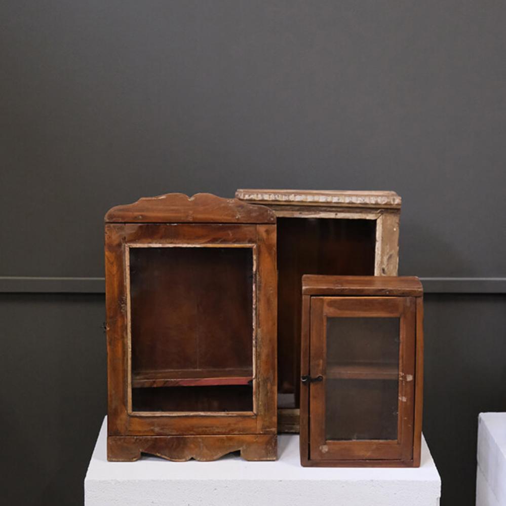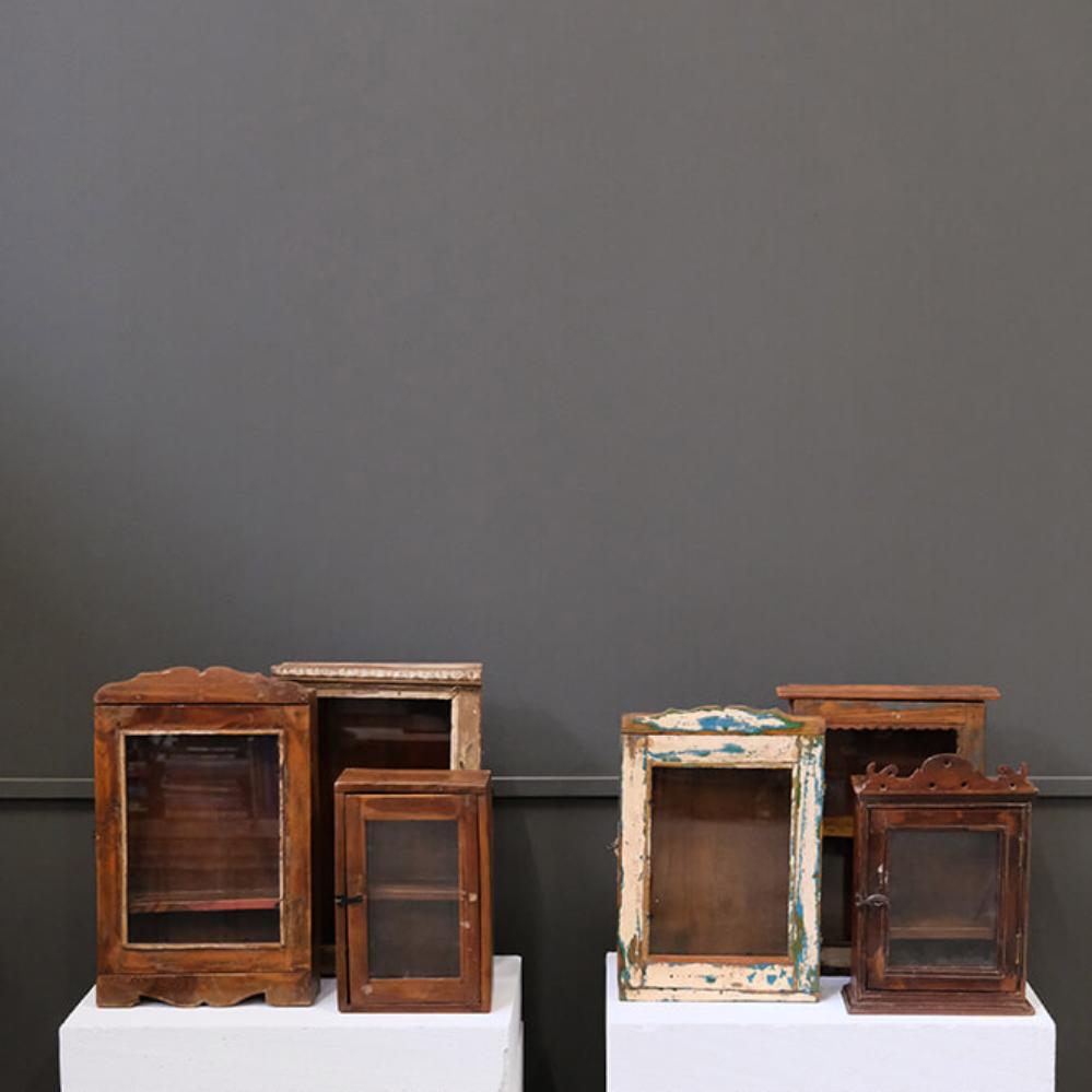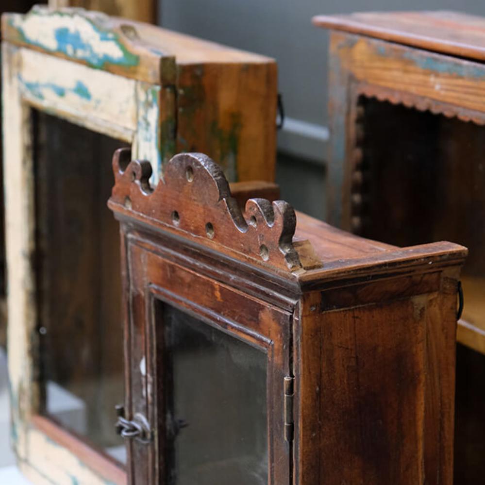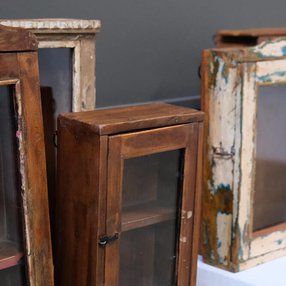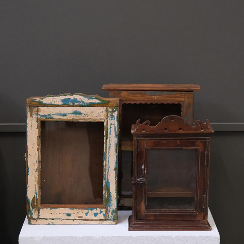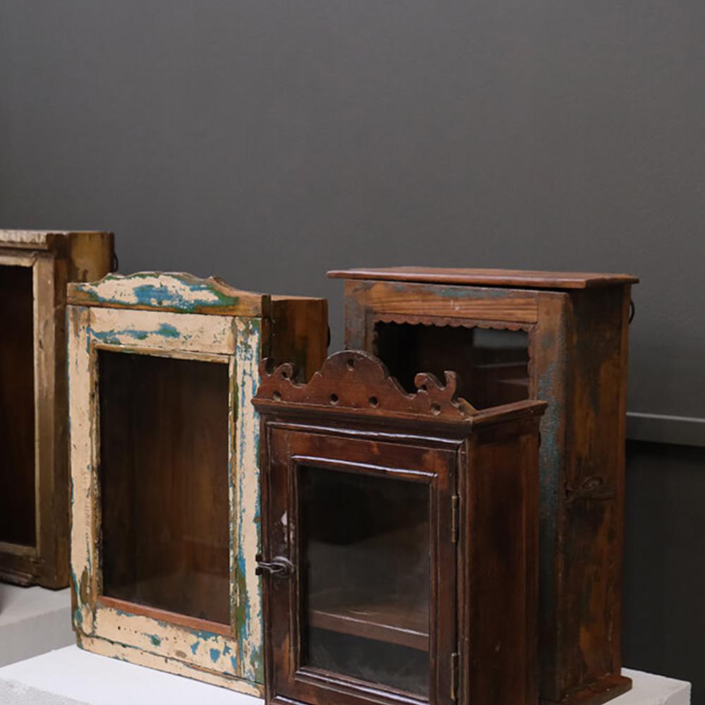 Disse gamle vægskabe er hver især unikke med deres brugsspor og originale detaljer. Hvert skab oser af autentisk charme fra den naturlige patina og de fine udskæringer og farverester. Disse skabe vil helt sikkert tilføje et strejf af historie og personlighed til dit rum. De små vægskabe er perfekte til at udstille småting, uanset om de hænger på væggen i køkkenet til krydderier, i stuen til pynteting eller i entréen til nøgler og andre småting. I en butik kan de bruges som dekorative displayenheder til små produkter, og i en restaurant kan de bidrage til et hyggeligt, rustikt miljø. Uanset hvor du placerer dem, vil de skabe en hyggelig atmosfære. Bemærk at nogle af vægskabene har hylder, andre ikke, nogle har pyntekant foroven, andre ikke, nogle har malingrester, andre ikke, ligesom alle vægskabene er forskellige i størrelsen. Har du specielle ønsker til skabets udseende, er vi kun et opkald væk.