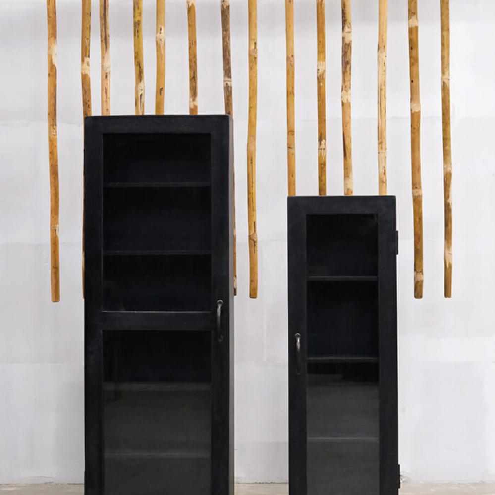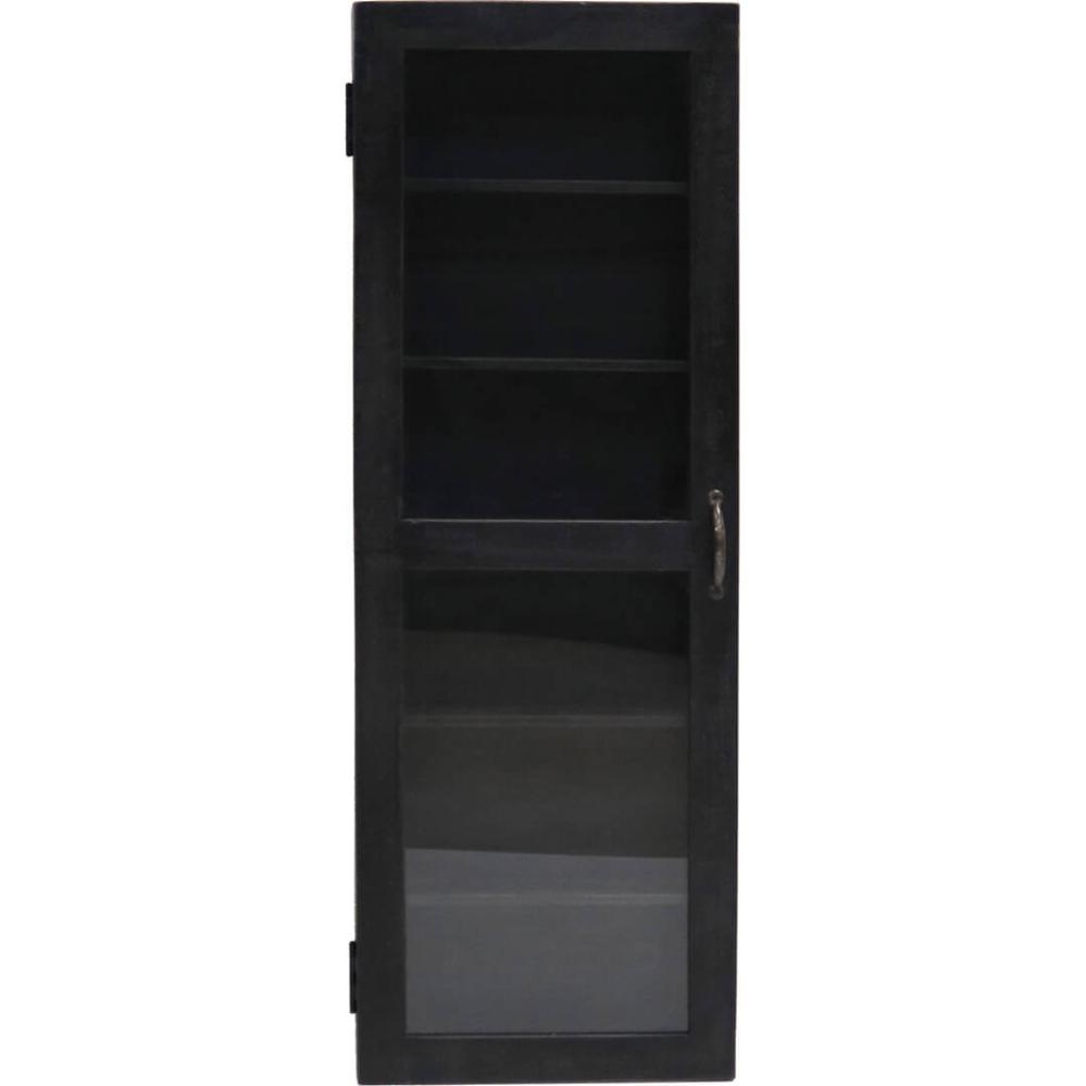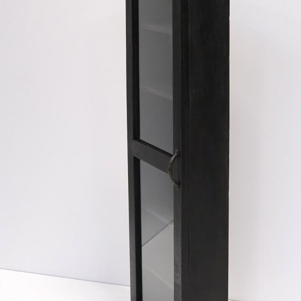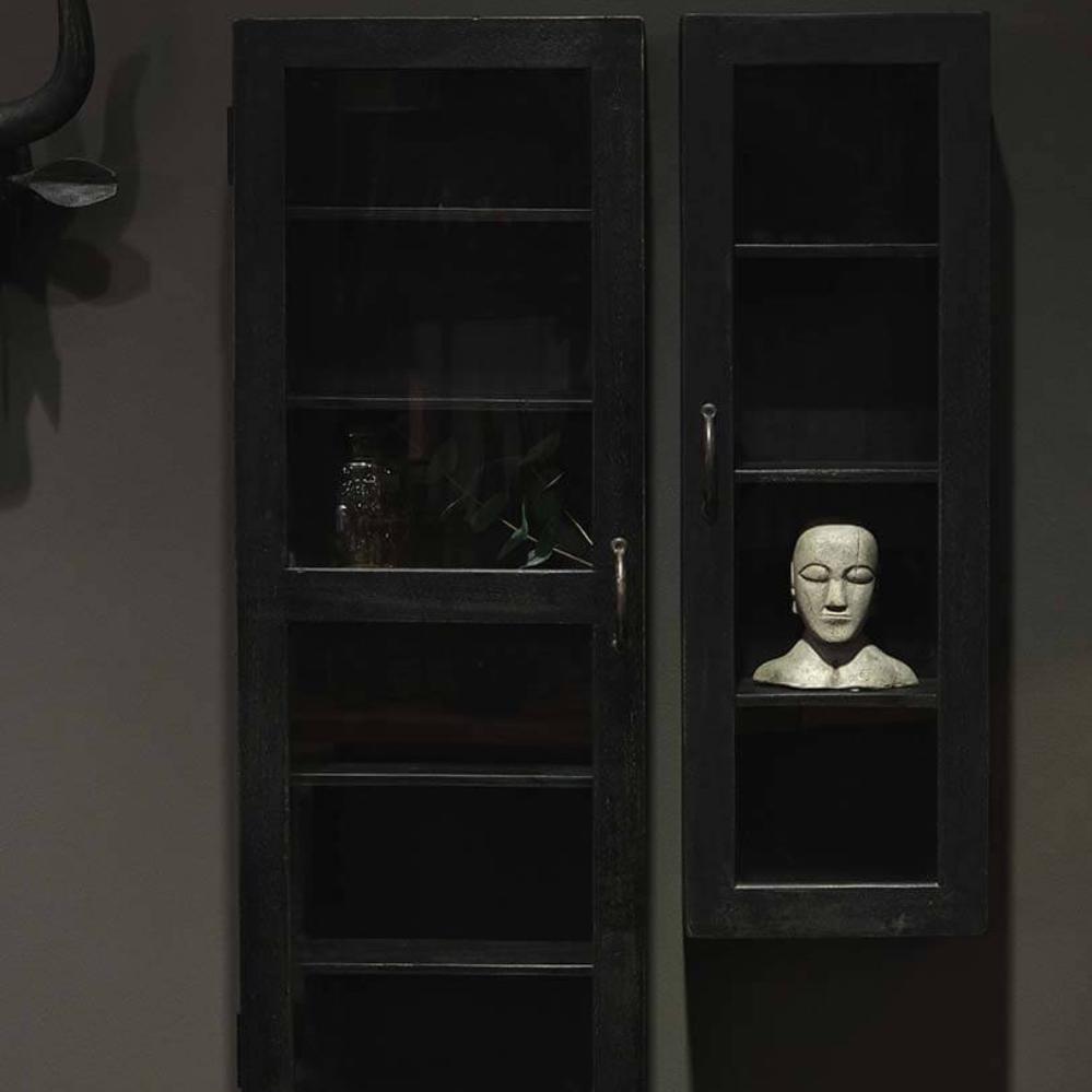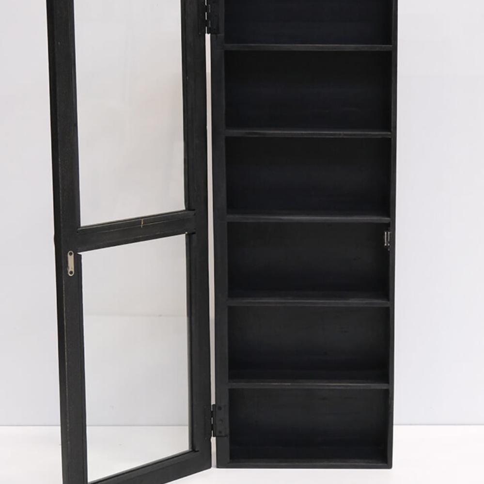 Savner du mere opbevaringsplads i din indretning?! Så er det altid et hit med et vægskab. Her finder du et af de fineste af slagsen. Sortmalet træ, en glaslåge, seks indvendige hylder, helt enkelt og stilrent design, smalt og fikst. Vægskabet fremstår let og elegant og vil opbevare dine ting på fornemmeste vis. Skabet findes også i en lavere model: D0908. Afstanden mellem hylderne er 18 cm.