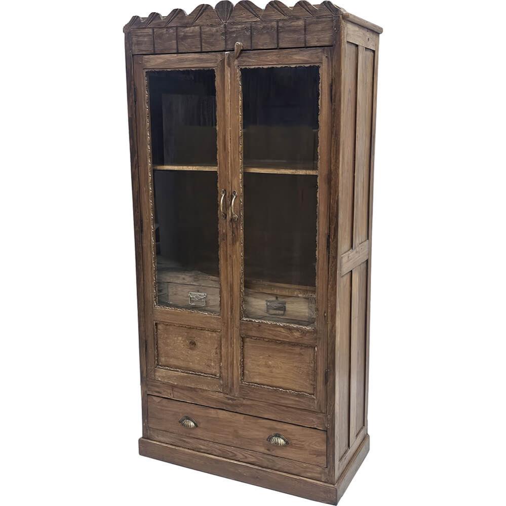 Et imponerende vitrineskab med masser af karakter og fine detaljer. Skabet er udført i træ med glaslåger, der giver et flot indblik til indholdet, og har både hylder og rummelige skuffer til opbevaring. De udskårne kanter og den dekorative top giver skabet et særligt udtryk, mens den naturlige overflade viser træets struktur og historie. Det store vitrineskab passer perfekt i et hjem eller i en butik, hvor det både tilfører varme og praktisk opbevaringsplads. Et møbel med et unikt håndværk og tidløs charme, der nemt bliver et blikfang i rummet.