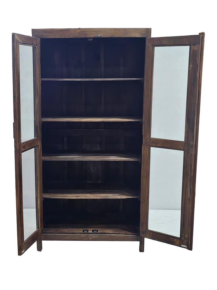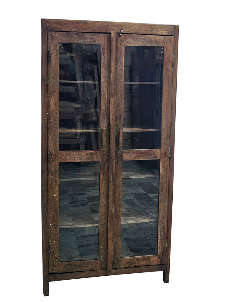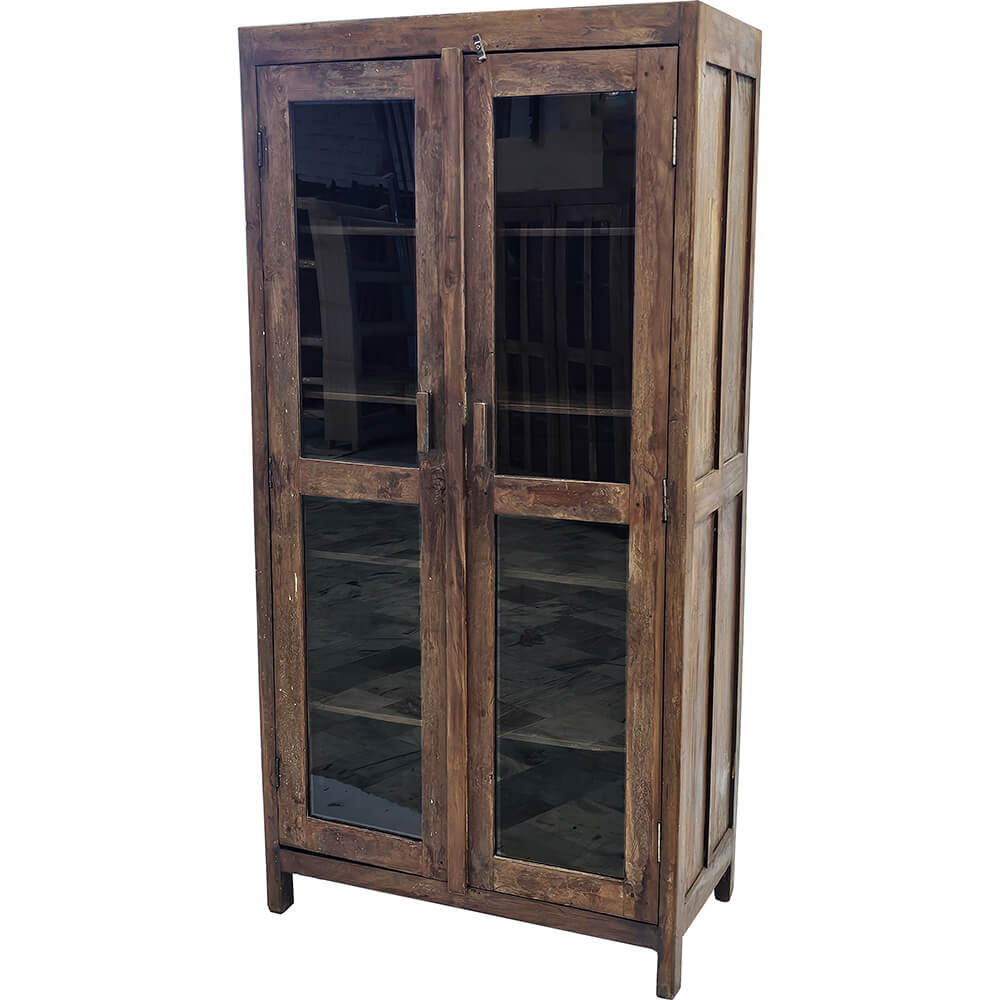 Dette gamle vitrineskab i træ har et enkelt og roligt udtryk, der passer perfekt ind i en varm og afslappet indretning. Skabet har to glaslåger, som giver et fint kig til indholdet og gør det oplagt til at vise service, glas, bøger eller små dekorative fund frem. Træet har en flot, naturlig patina med synlige spor af brug, som giver skabet karakter. De rene linjer og den smalle form gør det nemt at placere både i køkkenet, stuen, entréen eller i en butik, hvor det kan fungere som udstillingsskab. Et alsidigt møbel, der både er praktisk og dekorativt, og som tilfører rummet et rustikt og autentisk udtryk.