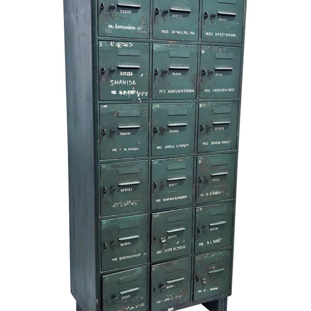 Unikt gammelt locker jernskab med et selvsikkert råt og maskulint look. Dette skab med en unik finish vil helt sikkert tilføre ekstra kant til din indretning. Jernskabet har 18 rum, og kan bruges til opbevaring af alt fra sko til huer og andre accessoires. Her får du et smukt stort skab med en lang historie og et tidligere liv i Fjernøsten. Skabene har forskellige numre, da de er fra et større parti. Patinaen og numrene kan derfor afvige fra billedet.