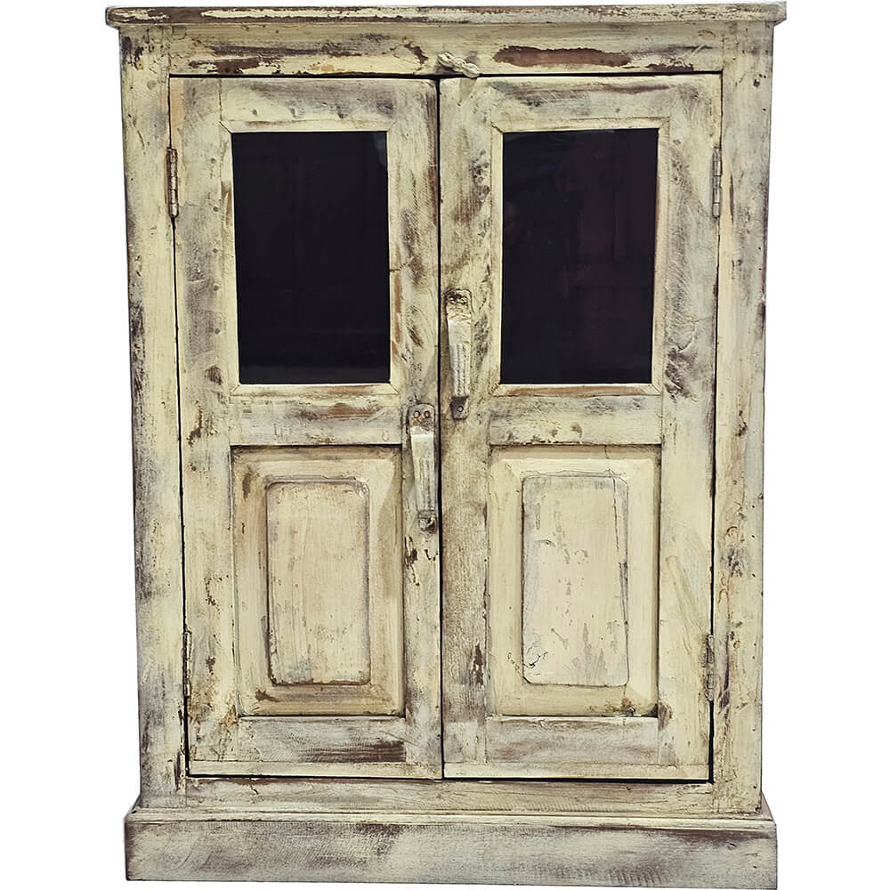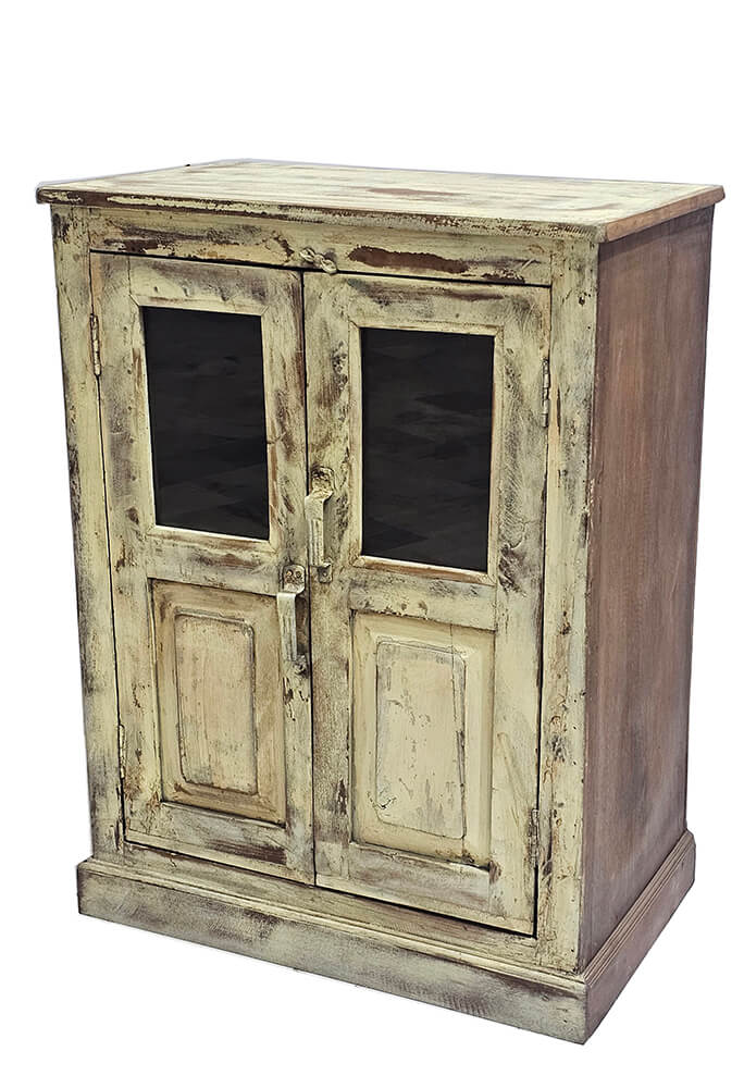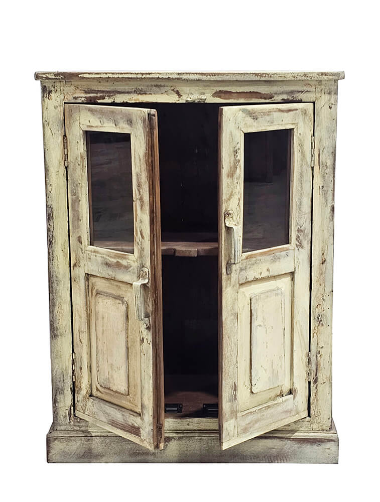 Denne vitrine i sart gul har masser af charme og et skønt, patineret udtryk. Den afdæmpede farve kombineret med den slidte overflade giver vitrinen et blødt og autentisk look, som passer perfekt ind i både landlig, vintage og nordisk indretning. De to låger med glas øverst gør det nemt at fremvise dine yndlingsting, mens træets struktur og spor af tidligere brug tilfører varme og personlighed. Vitrinen er ideel til service, glas, små samlinger eller dekorative elementer, som fortjener at blive set. Den kompakte størrelse gør den let at placere i stuen, køkkenet, entréen eller din butik. Et unikt møbel med karakter, der tilfører sjæl og historie til din indretning.