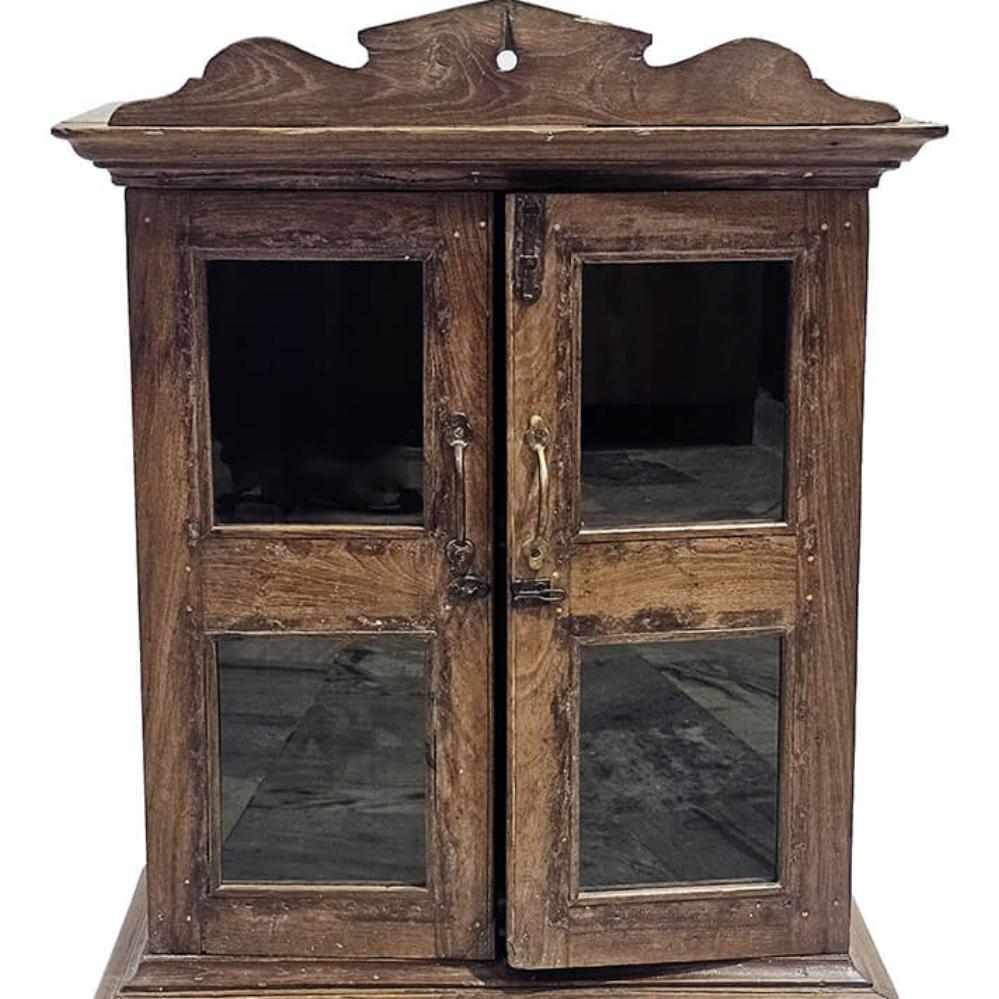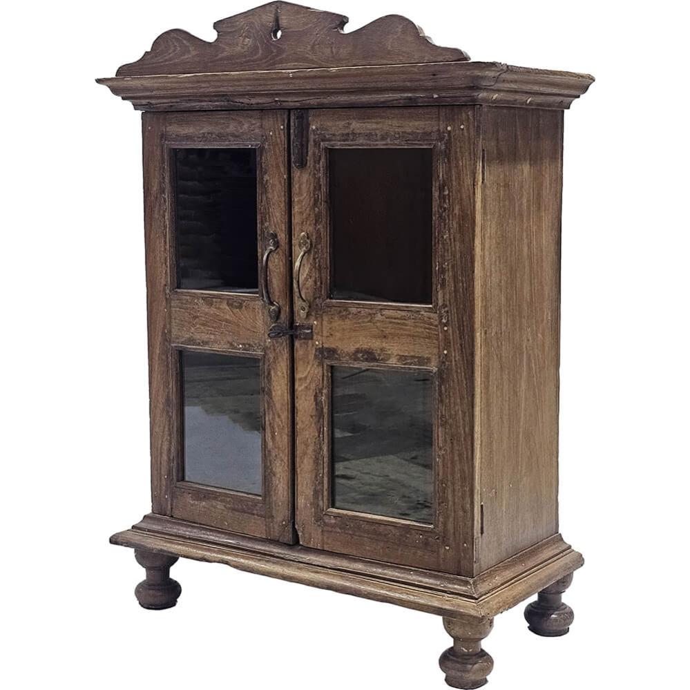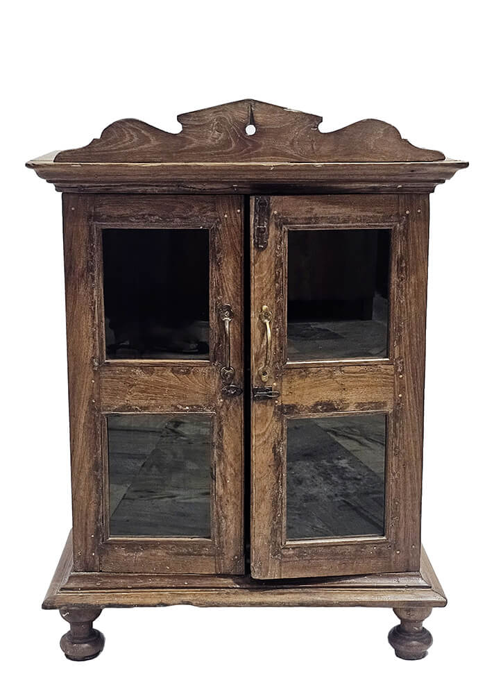 Et smukt vitrineskab i massivt træ med fine udskæringer og detaljer, der giver det et charmerende og klassisk udtryk. Skabet har to glaslåger, som giver et let og indbydende look, og det er oplagt til at fremvise glas, service eller dekorative genstande. De drejede ben og den smukt formede topkant tilføjer karakter og gør skabet til et særligt blikfang i rummet. Den naturlige træfarve og den let patinerede overflade understreger dets rustikke charme og tidløse udtryk. Et alsidigt vitrineskab, der passer perfekt i både køkkenet, entréen eller caféindretningen. Med sine smukke detaljer bringer det varme og personlighed ind i hjemmet.