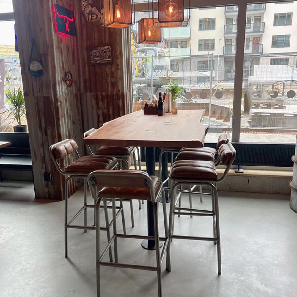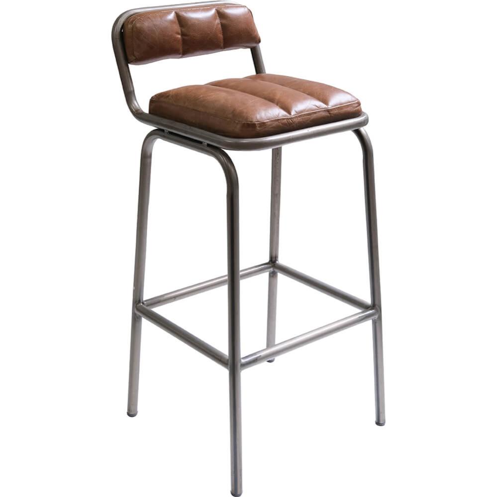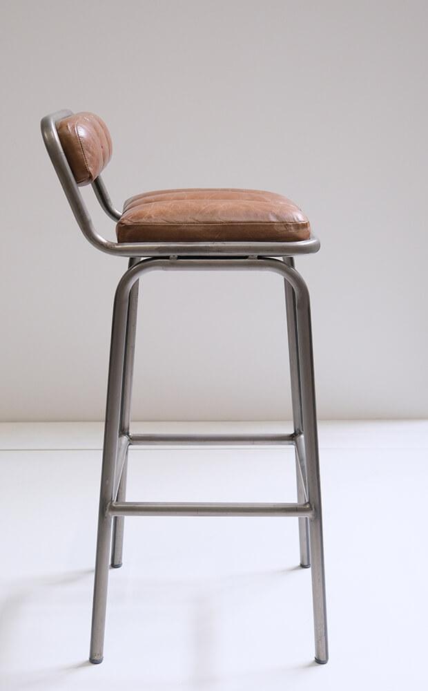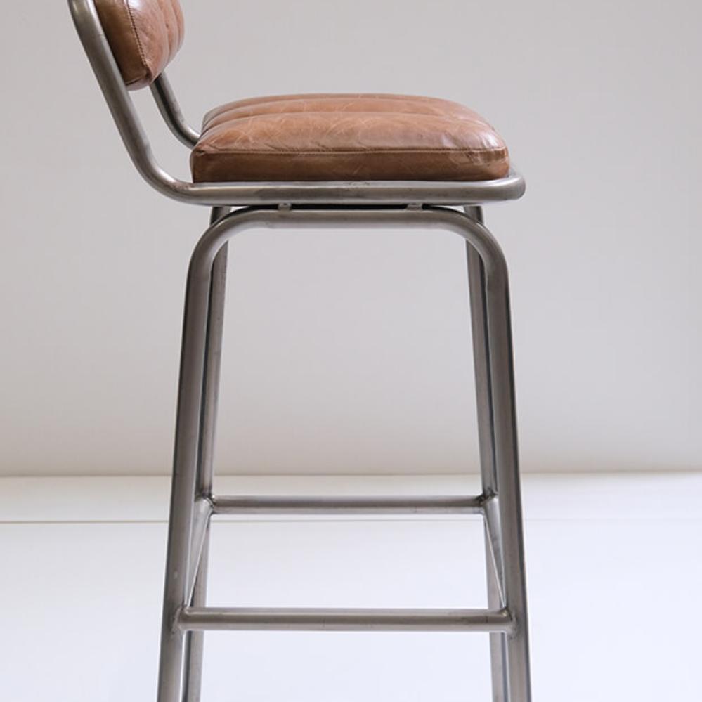 Lækker barstol med bløde former og endeløs komfort. Barstolen er beklædt med polstret brunt læder i sæde og ryg. Det høje robuste stel i jern giver barstolen et råt og maskulint udtryk.