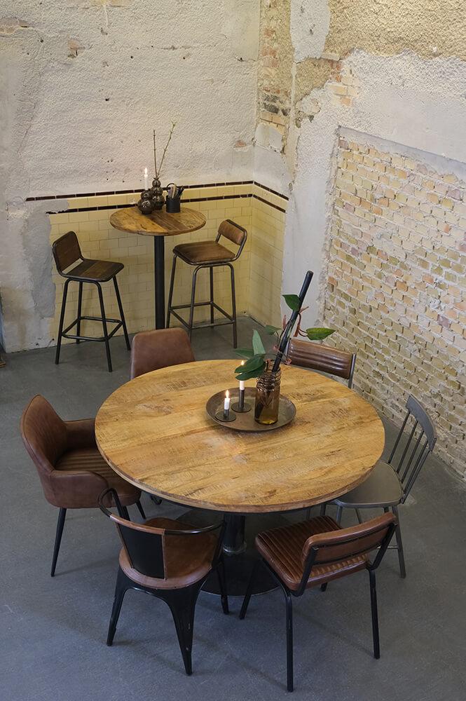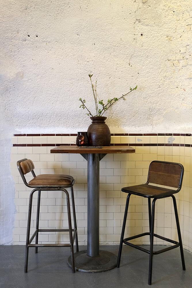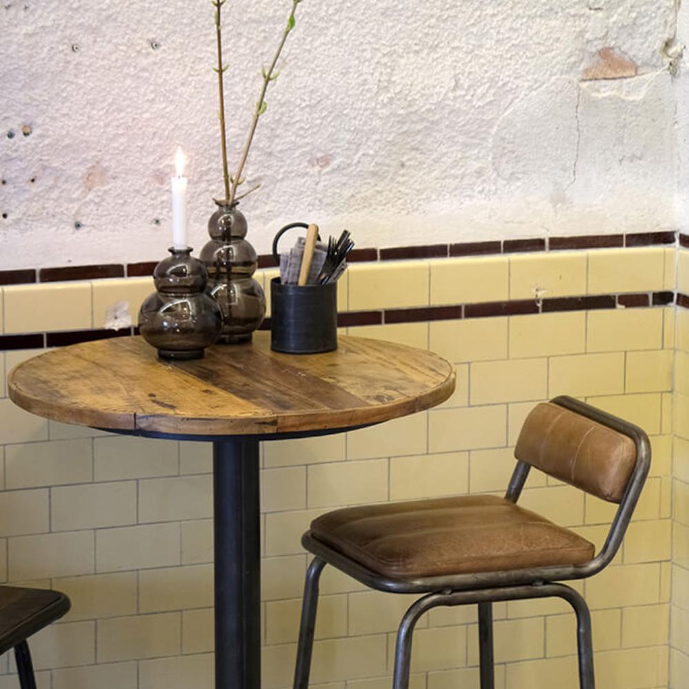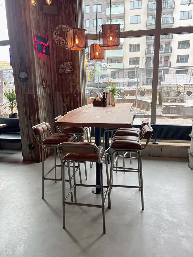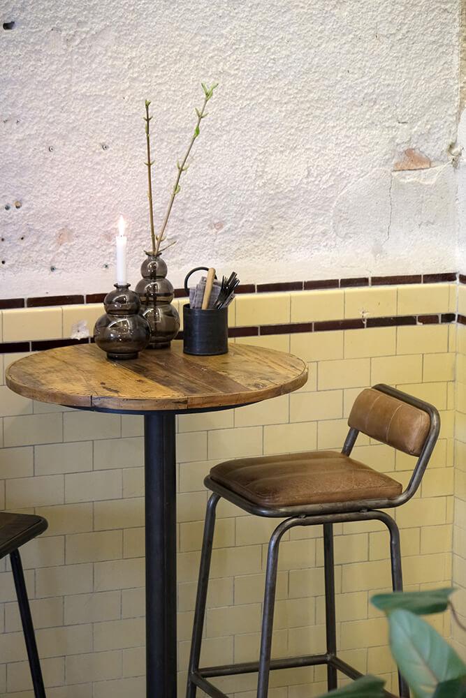 Lækker barstol med bløde former og endeløs komfort. Barstolen er beklædt med polstret brunt læder i sæde og ryg. Det høje robuste stel i jern giver barstolen et råt og maskulint udtryk.