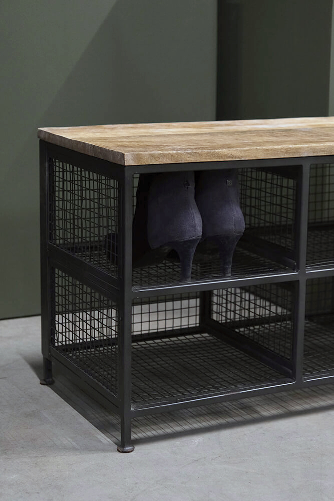 Denne skoreol er både praktisk og stilfuld med sin kombination af træ og metal. De 8 rummelige sektioner giver masser af plads til sko, eller kasser til opbevaring af eksempelvis tørklæder, huer og handsker. Det solide træ på toppen fungerer perfekt som en bænk, hvilket gør skoreolen ideel til entréen eller garderoben. Metallets industrielle look giver møblet en rå kant, der passer godt ind i moderne, minimalistiske eller rustikke indretninger. En funktionel løsning, der både organiserer og tilføjer karakter til dit hjem. Hvert rum måler: H:17 cm., V:18 cm., D:33 cm.