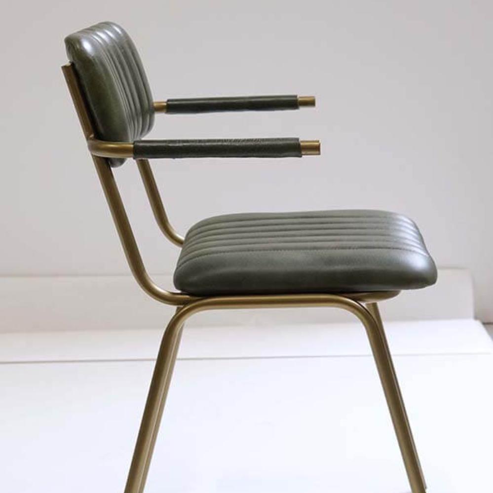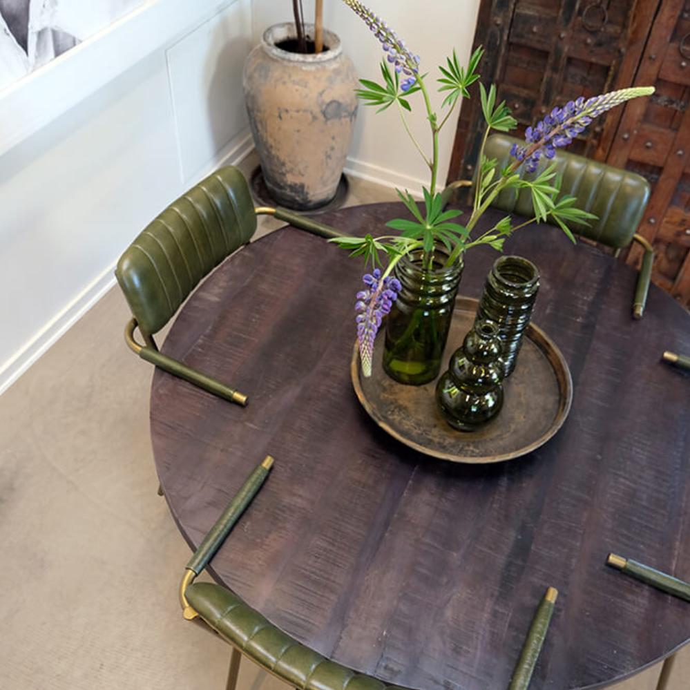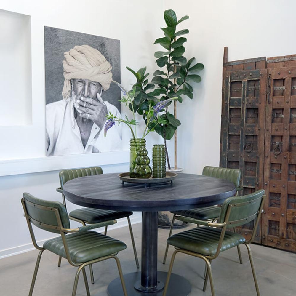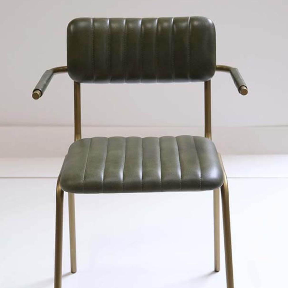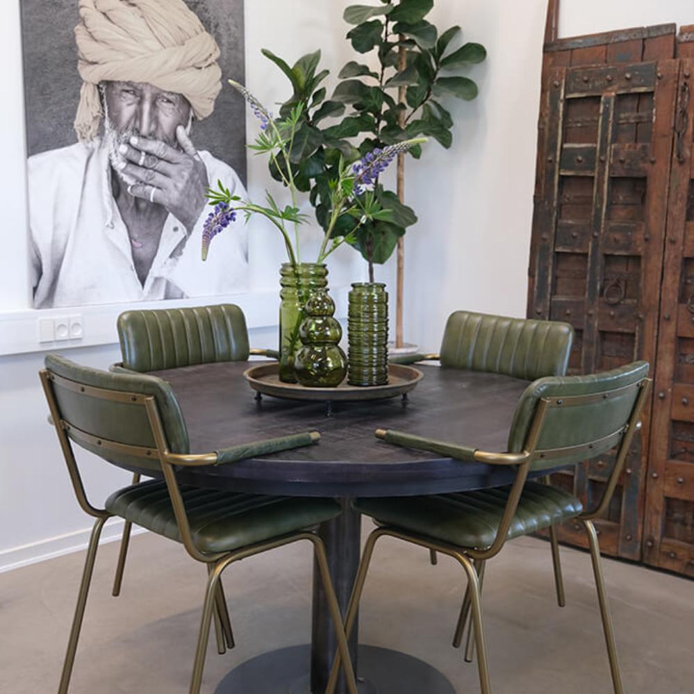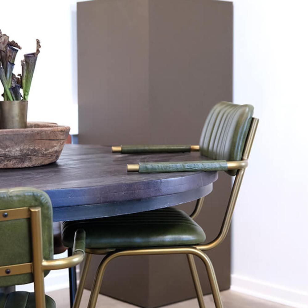 Denne Diner spisebordstol med armlæn er den rigtige blanding af rå attitude og raffineret stil. Det messinglakerede jernstel giver et varmt, næsten gyldent skær, der står i smuk kontrast til det mørkegrønne bøffelskind, som både er slidstærkt og behageligt at sidde i. Det karakteristiske diner-design med quiltede syninger og polstring i både sæde og ryg giver stolen en retro vibe med moderne holdning. Og armlænene? De gør ikke kun stolen ekstra komfortabel, de gør det også nemt at hænge den op på bordkanten, så rengøringen bliver lidt mindre besværlig i en travl hverdag. Stolen er oplagt til restauranter, caféer og spisesteder med et øje for detaljer. Den fungerer også perfekt i det private hjem, hvor man gerne vil tilføje lidt vintage-luksus med kant omkring spisebordet. En spisebordsstol der både ser godt ud, føles godt og gør hverdagen lidt lettere.