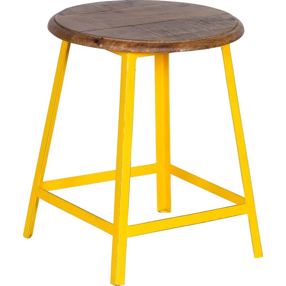 Denne skammel er en frisk og iøjnefaldende kombination af et moderne udtryk og naturlige materialer. Det gule stel tilføjer et strejf af farve og energi, mens det mørke, runde træsæde skaber en fin kontrast og giver skamlen en varm og rustik følelse. Det stærke metalstel sikrer stabilitet og holdbarhed, mens træets naturlige patina tilfører charme og personlighed. Denne skammel er perfekt til at bringe et farverigt og legende element ind i ethvert rum, om det er i en café, et køkken eller en bar.