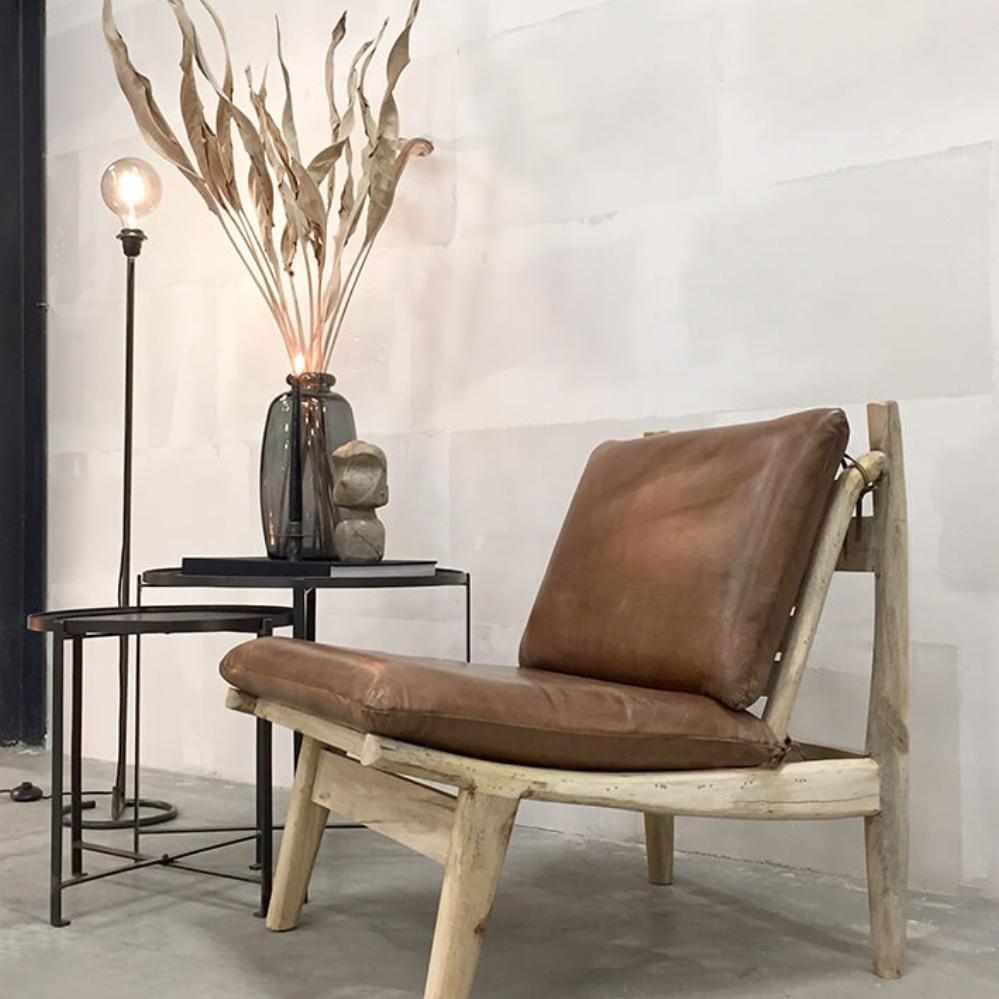 James lækker tilbagelænet loungestol med brune læderhynder der med tiden vil få en flot patina og et blødt formet stel der er i mango træ. Siddekomforten er i top, da sæde og ryg er formet så du sidder optimalt. Dens tidløse design kan kombineres med andre forskellige møbler, men kan også sagtens stå alene. OBS! Der kan forekomme gult udtræk i træets struktur, dette er harpiks.