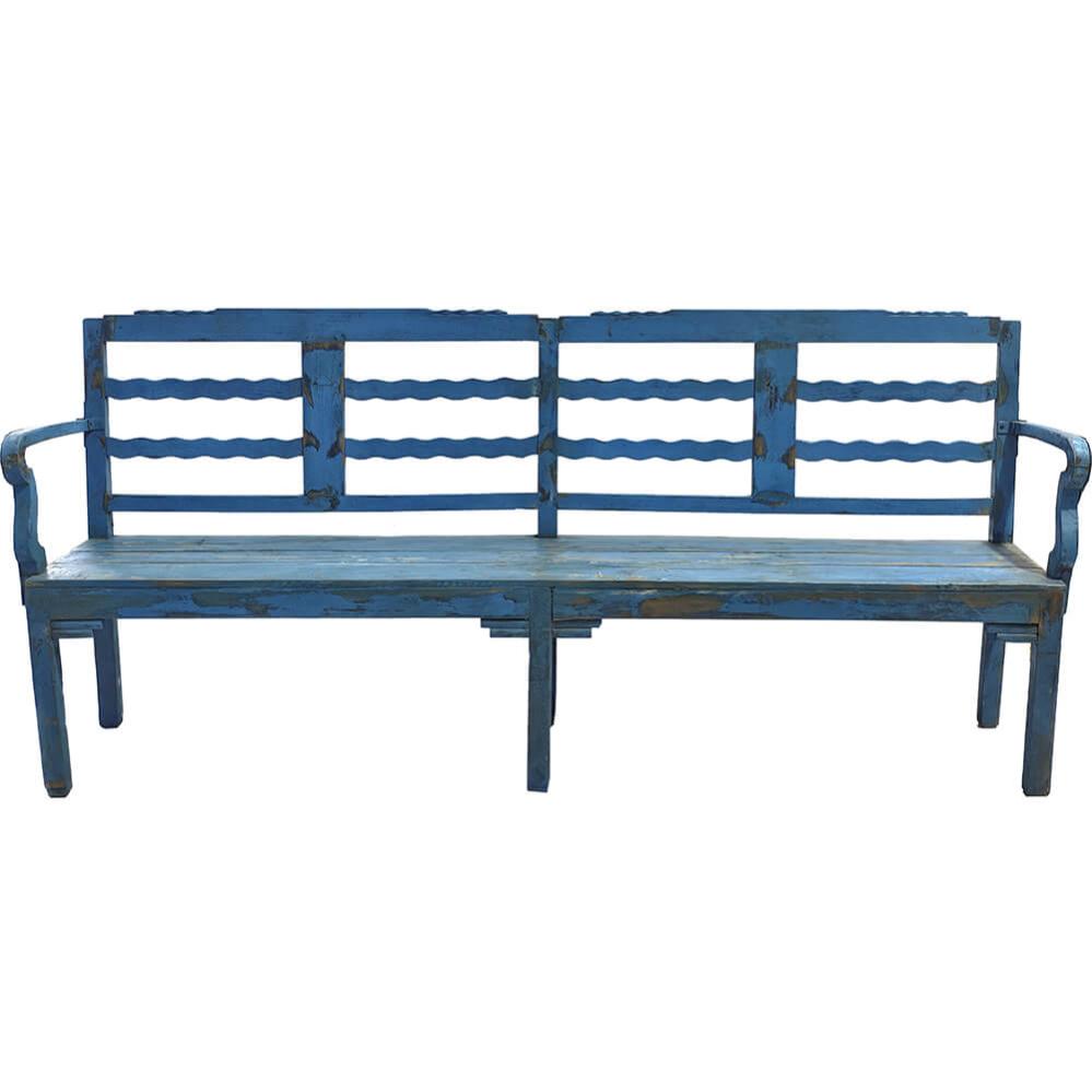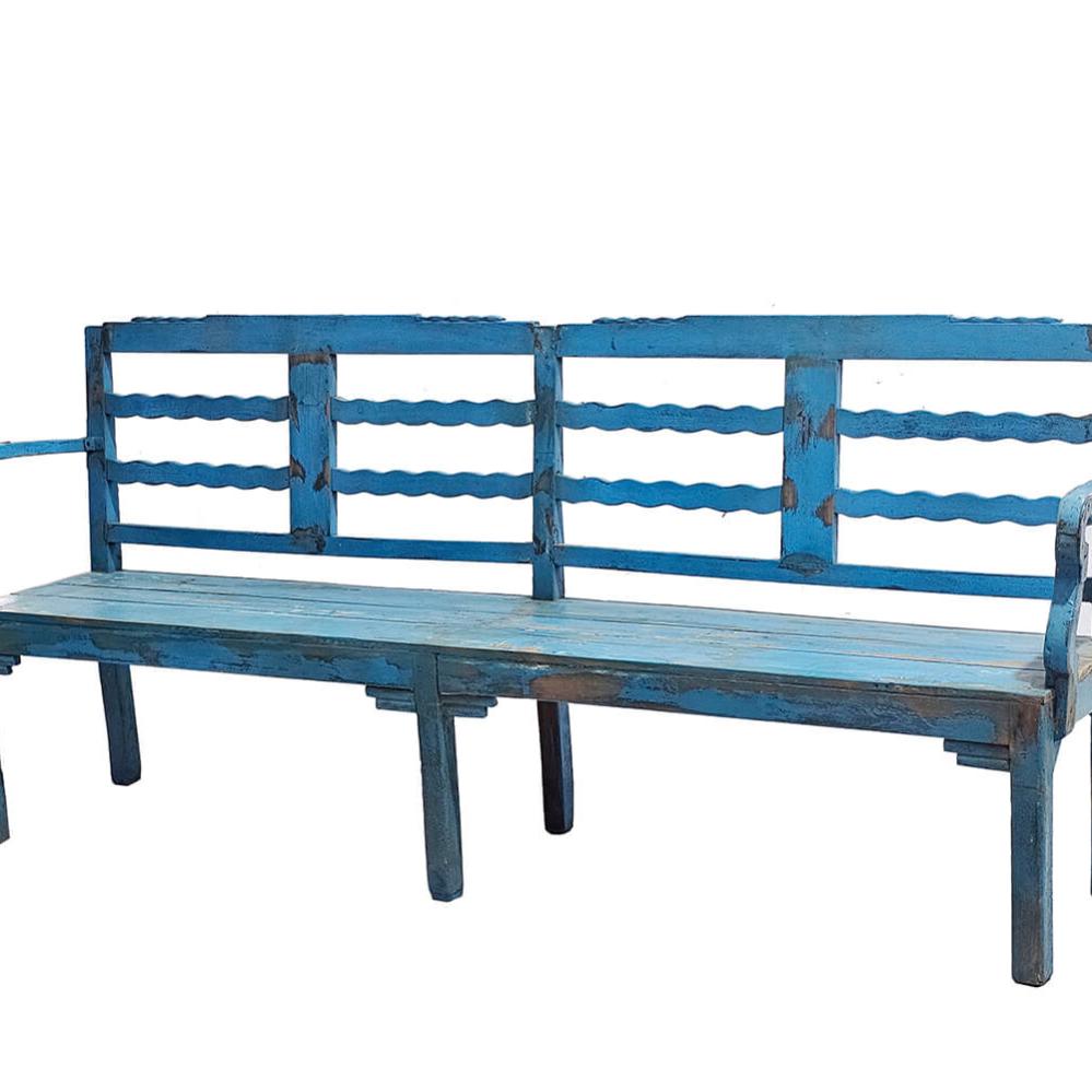 Her får du en bænk, der nægter at gå i ét med tapetet. Den livlige blå farve og de bølgede tremmer i ryglænet giver bænken et nærmest legende udtryk, mens den slidte maling og patina afslører, at den allerede har levet et langt og godt liv. Med sin generøse længde er der rigeligt plads til både kaffepauser og gode samtaler. Den solide trækonstruktion og de rundede armlæn gør den både behagelig og praktisk, uanset om den skal stå i entréen, i orangeriet eller måske som blikfang i butikken. En bænk med holdning og historie.