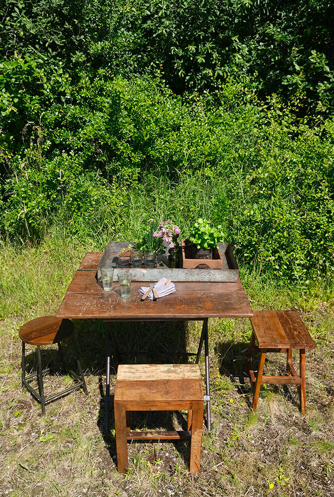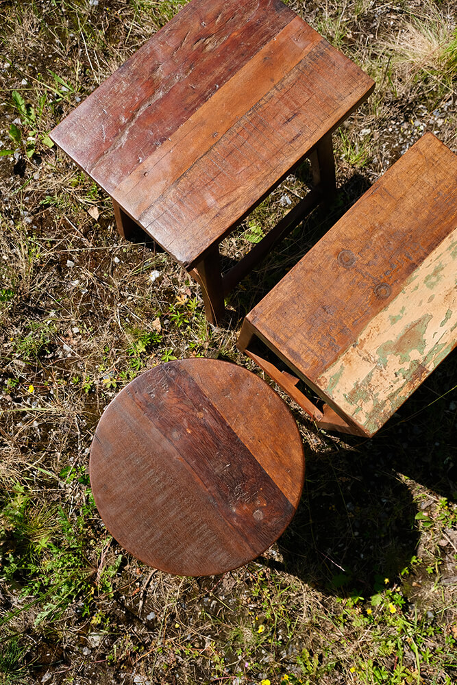 Fin jernskammel med rundt sæde i genanvendt træ. Skamlen har et enkelt og lidt rustikt look og vil passe fint ind i den moderne indretning. Brug skamlen som supplement ved spisebordet eller som pynt i entreen eller til et lille sidebord ved sengen.