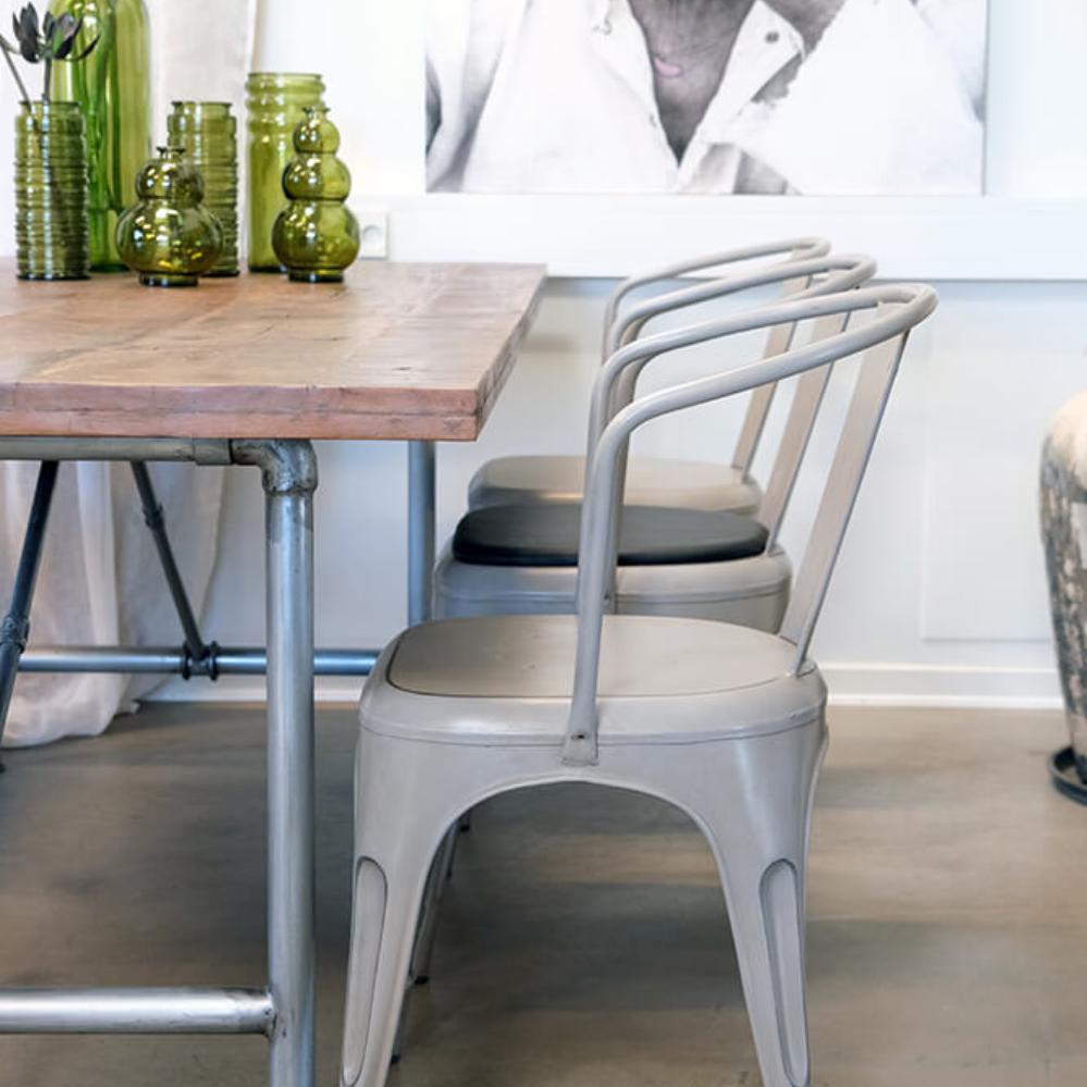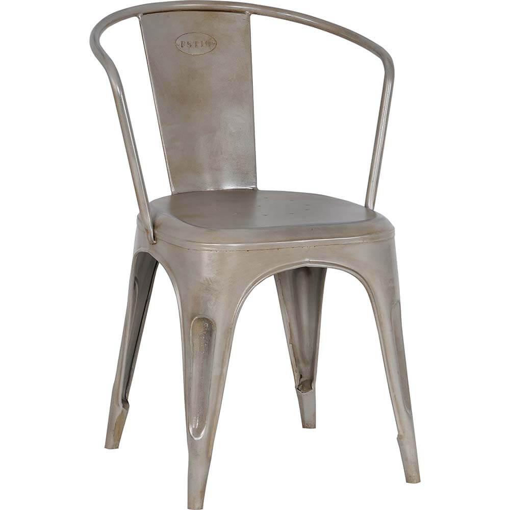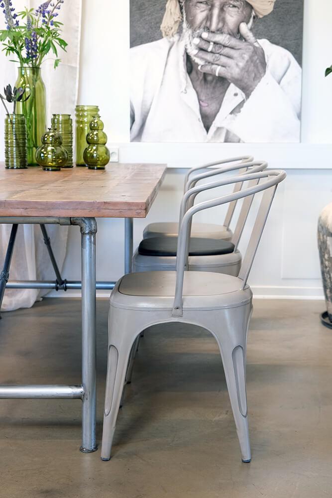 Denne spisebordsstol i patineret grå malet metal har et råt og industrielt design, der passer perfekt til både moderne og vintage indretninger. Med sit enkle, men robuste udseende, tilføjer stolen en cool kant til ethvert spiseområde. Det patinerede look giver stolen et slidt og autentisk udseende, som bidrager til dens rustikke charme. Det buede ryglæn og armlæn sikrer komfort, samtidig med at det minimalistiske design holder stolen både funktionel og stilfuld. Perfekt til caféer, restauranter eller det hjem, hvor et industrielt look ønskes.
