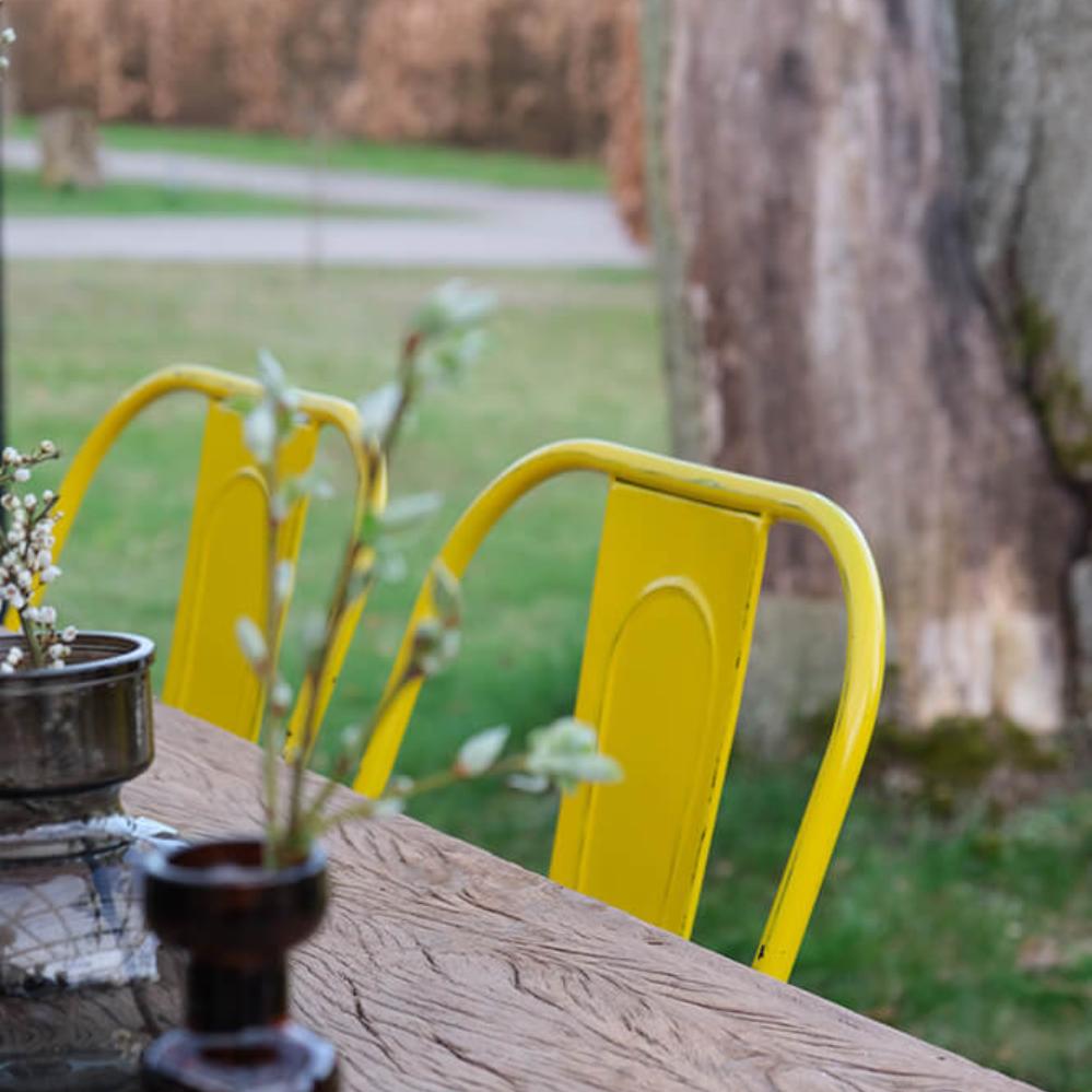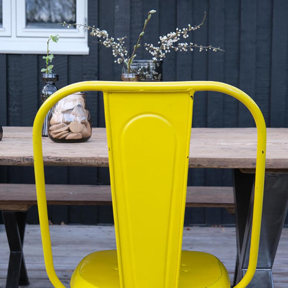 Super cool Living spisebordsstol i jern med smukt patina og højt ryglæn. Med sin gule farve vil den bestemt gøre sig bemærket hos dine gæster. Stolen har en fed patina, som giver den charme og personlighed. Hvis du elsker indretning, der ikke er helt anonym, så må du simpelthen eje denne iøjnefaldende gule stol. Tilføj ekstra komfort med en læderhynde i sort (varenummer M1402) eller brun (varenummer M1405).