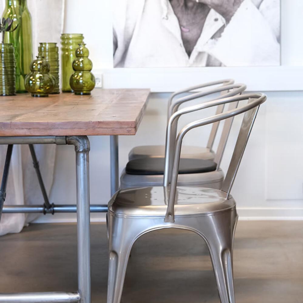 Denne klassiske Trademark Living spisebordsstol blev produceret første gang i 2010. Det fremgår også af det lille skilt der er på ryglænet på stolen FST10. Det er en rustik og robust stol med et industrielt udseende. Hvis du ønsker mere komfort, kan du bestille en læderhynde i enten sort eller brun læder. Se i webshoppen under M1402 eller M1405. Du kan også lægge et skind på stolen hvis du ønsker at skabe kontrast til det rå. Denne stol er i shiny finish. Hvis du ønsker en anden farve eller finish, er der mange andre spisebordsstole at vælge imellem i serien Living. Stolene er også flotte at mixe i farver og finish rundt om et stort mødebord, cafébord eller spisebord.