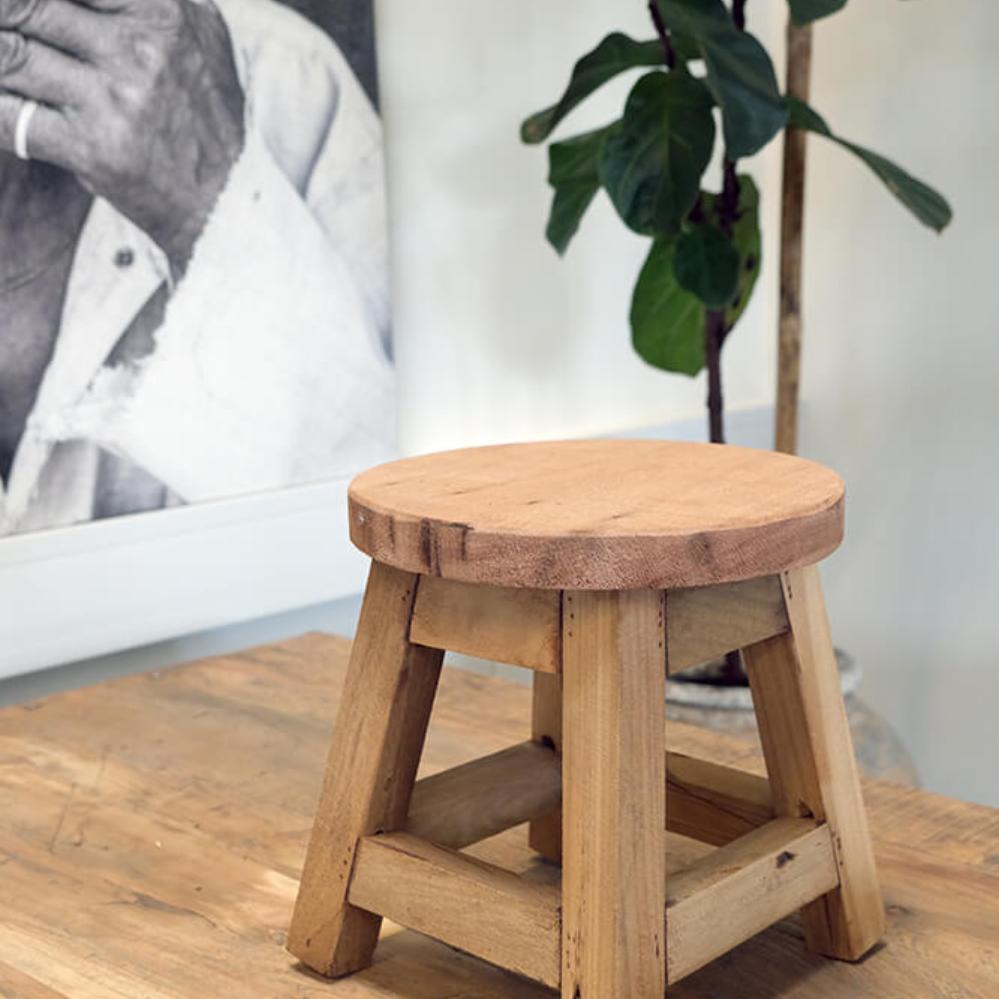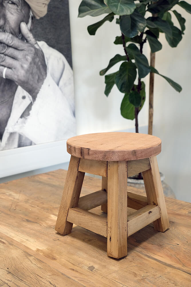 Enkel, rustik og praktisk – denne lille trætaburet bringer et strejf af nordisk charme ind i enhver indretning. Den er fremstillet af massivt genanvendt træ med et rundt sæde og en solid base, der sikrer stabilitet. Perfekt som en dekorativ piedestal til en plante eller en lampe. Dens rå og naturlige finish giver den et autentisk og tidløst look, der passer ind i alt fra minimalistiske skandinaviske hjem til rustikke caféer og butikker.