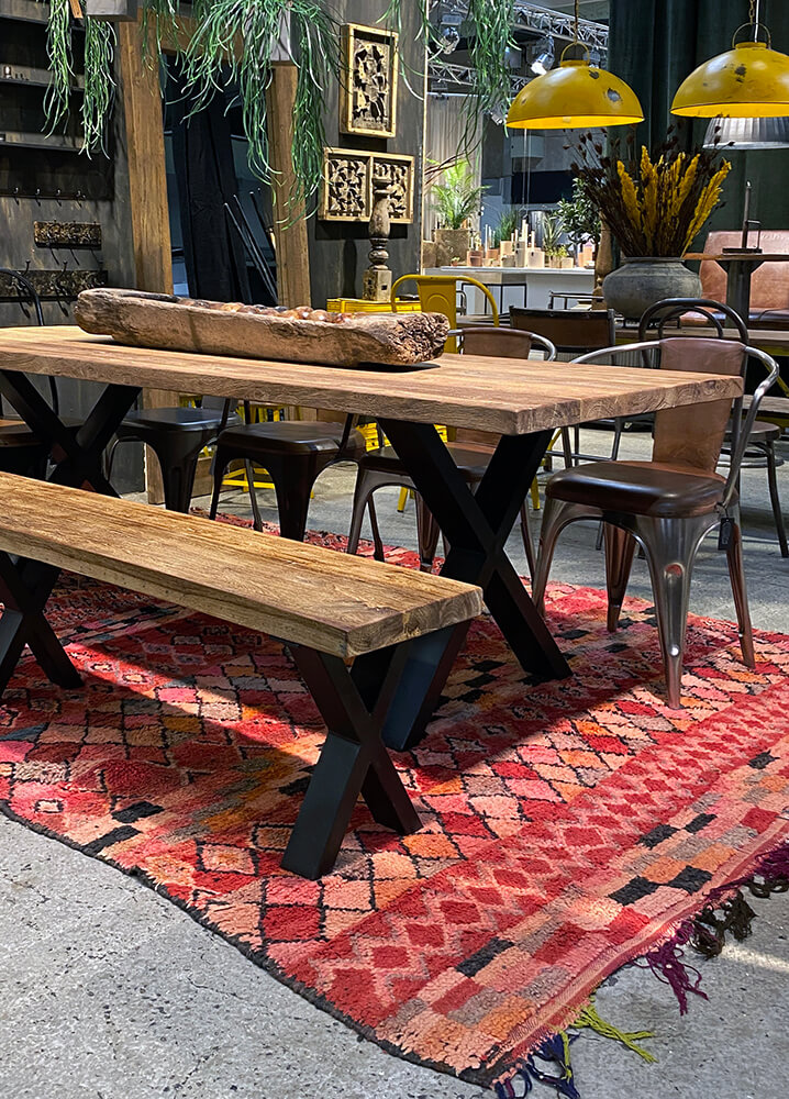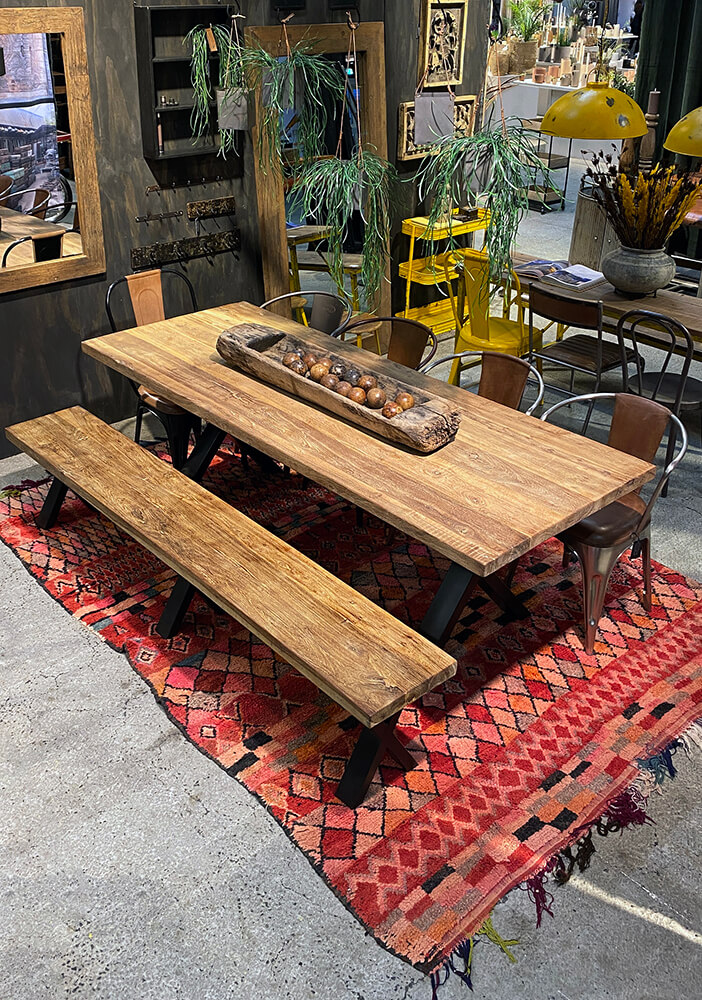 Lang bænk i rustik træ med et solidt krydsstel i jern, der kombinerer skønhed og funktionalitet. Denne imponerende bænk tilbyder rigelig siddeplads og er et smukt eksempel på godt håndværk. Det rustikke træ og det robuste jernstel skaber en fed kontrast, der vil tilføje karakter til ethvert rum. Brug den som en stilfuld siddeplads ved spisebordet, i entréen eller hvor som helst, hvor du ønsker at tilføre en unik rustik charme. Vores bænk i rustik træ er den perfekte kombination af æstetik og praktik. (ca. 4,5 cm tykt) Find et matchende bord her varenummer: M03132 samt en matchende mindre bænk under: M1854