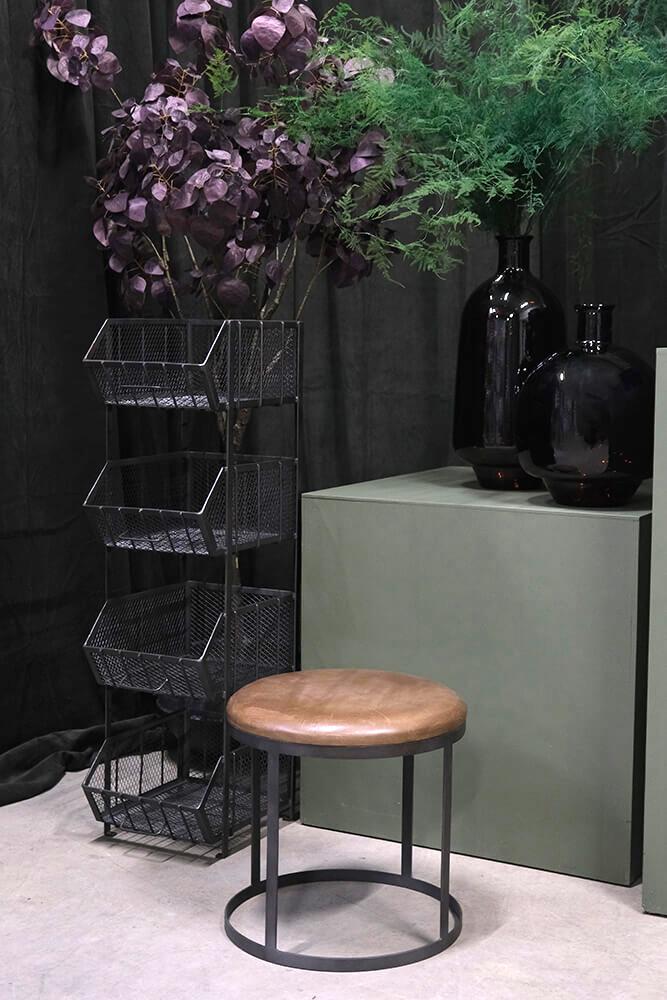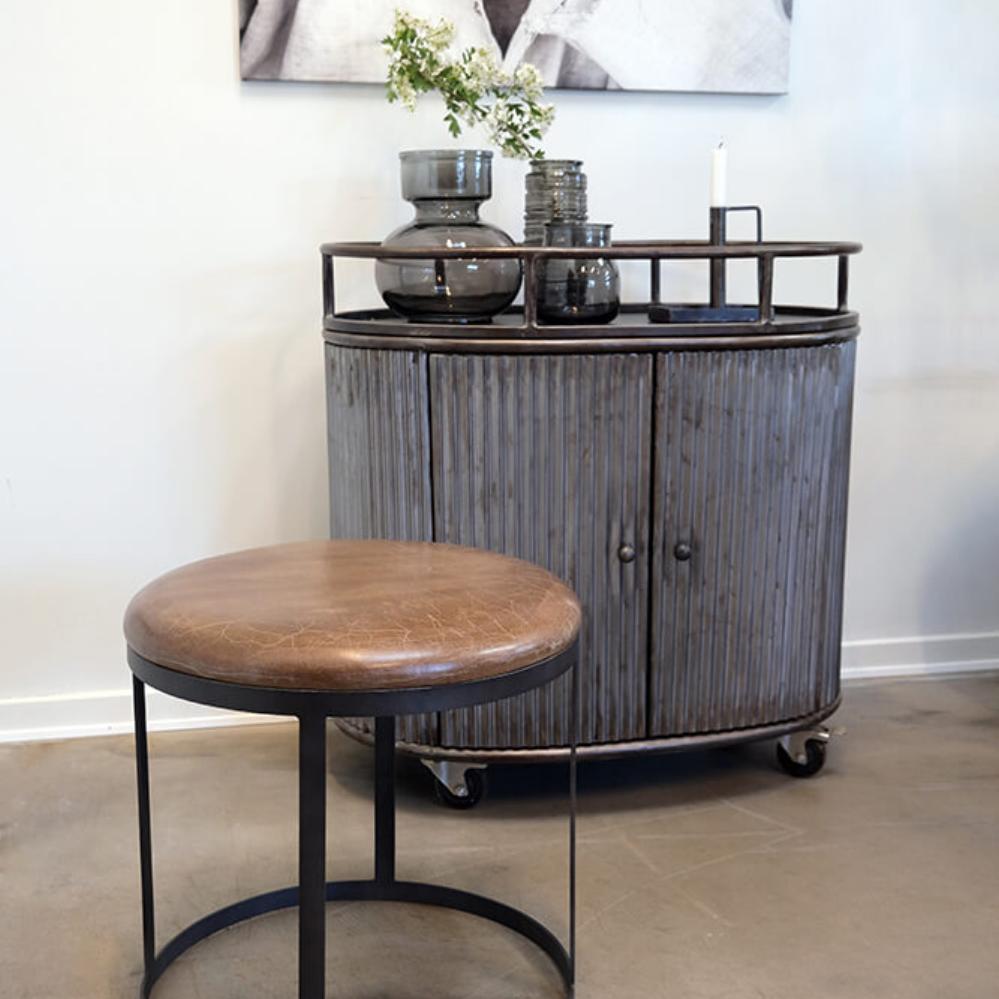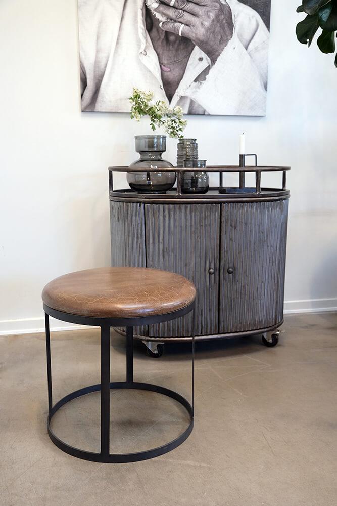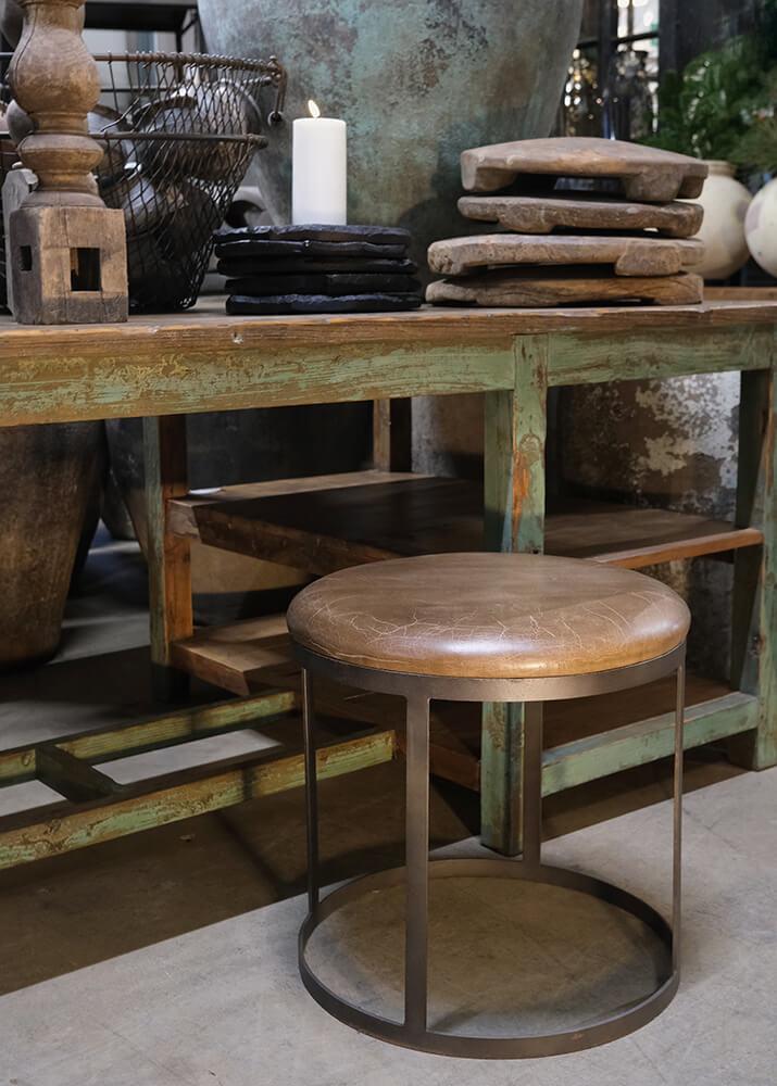 Denne jernskammel med rundt lædersæde er en perfekt kombination af det rå og funktionelle. Det robuste jernstel giver skamlen en industriel charme, mens det bløde, polstrede lædersæde tilføjer komfort og varme. Læderets naturlige patina skaber et autentisk og tidløst udtryk, der passer godt ind i både moderne og rustikke omgivelser. Ideel som ekstra siddeplads, en dekorativ detalje i stuen, gangen eller køkkenet. En alsidig skammel, der både er praktisk og cool.
